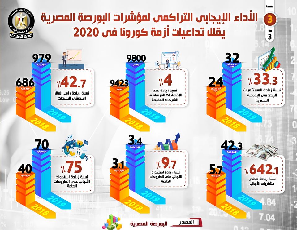 وفي هذا الصدد، نشر المركز الإعلامي لمجلس الوزراء، إنفوجرافاً سلط من خلاله الضوء على أوجه التعافي في البورصة المصرية.