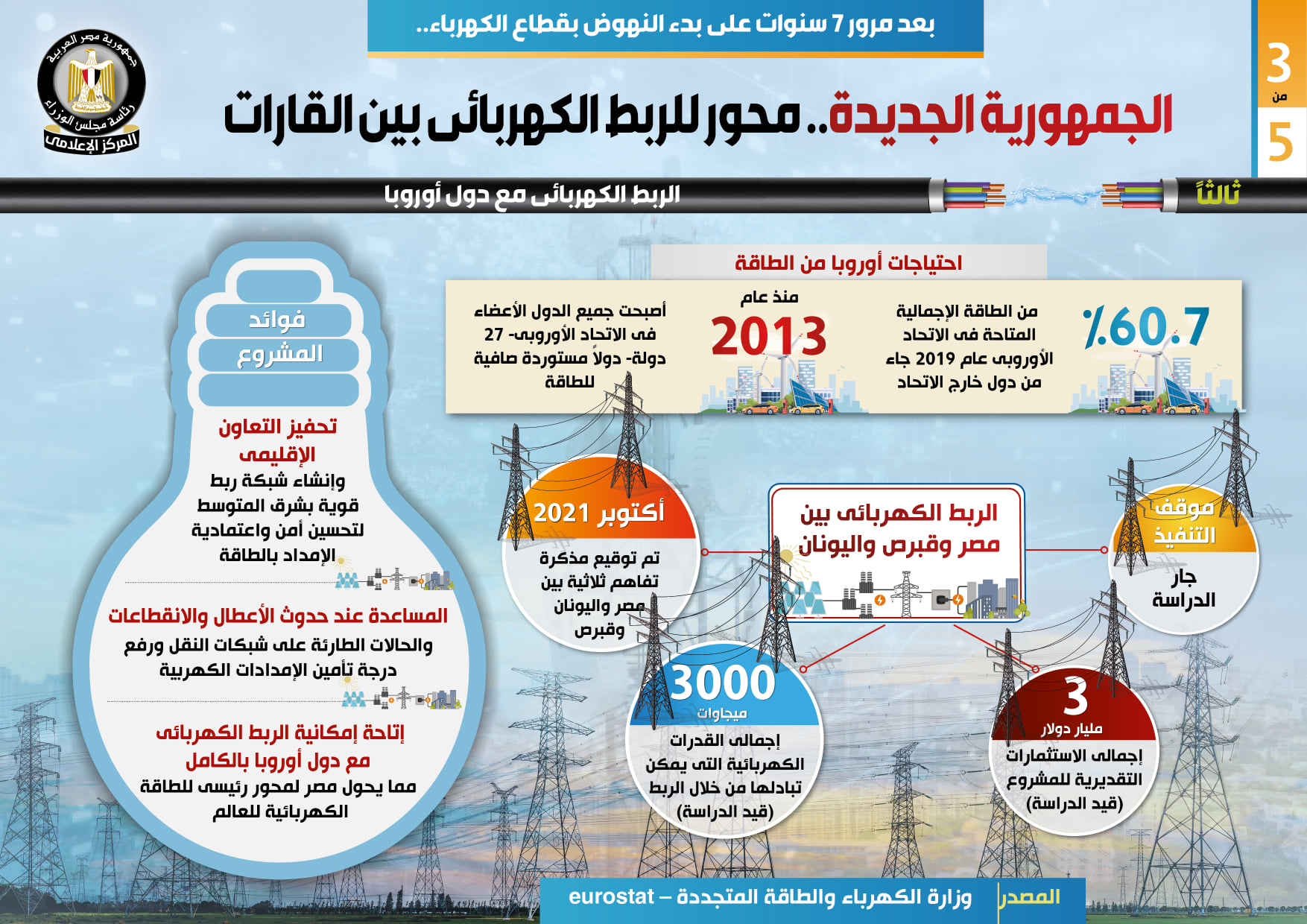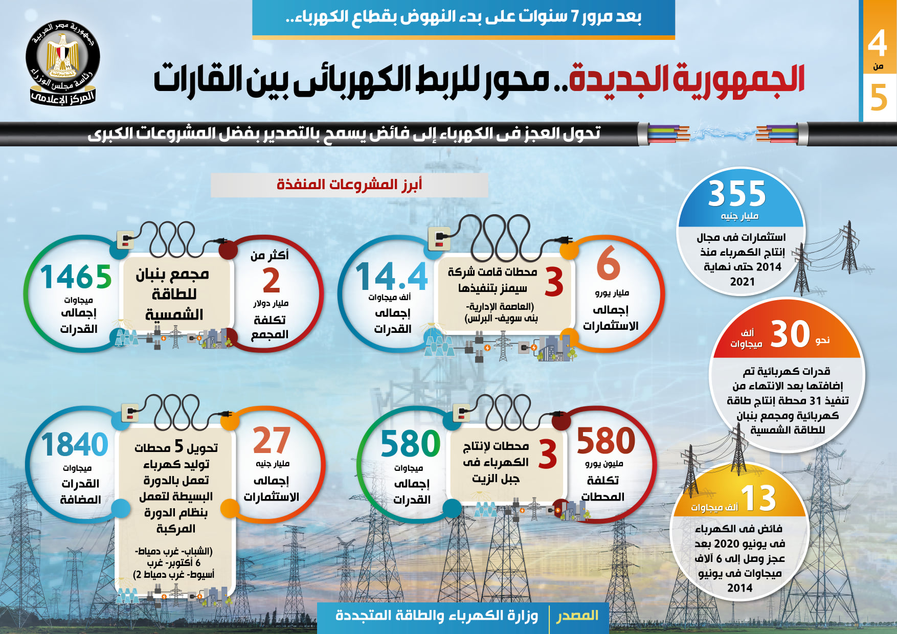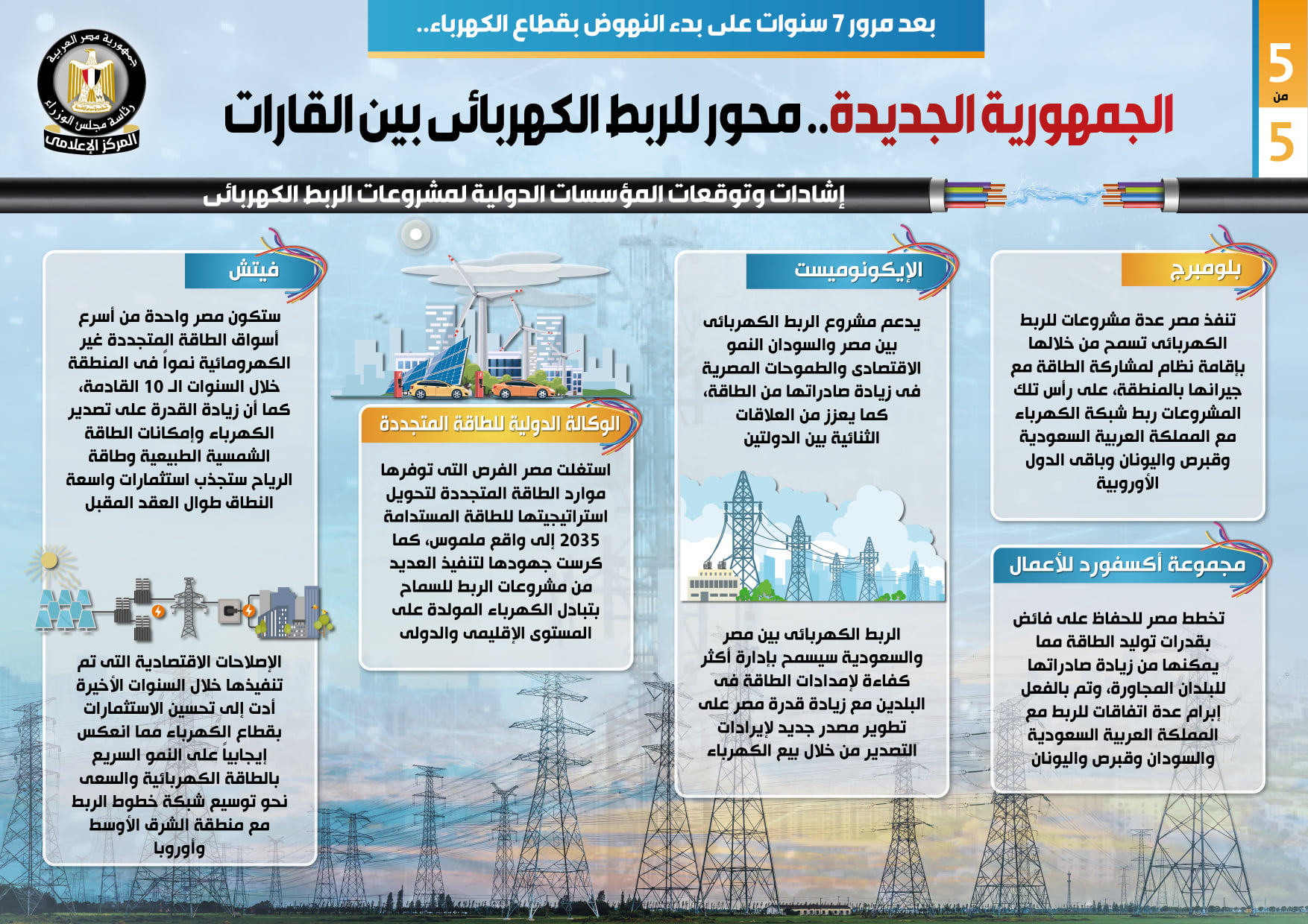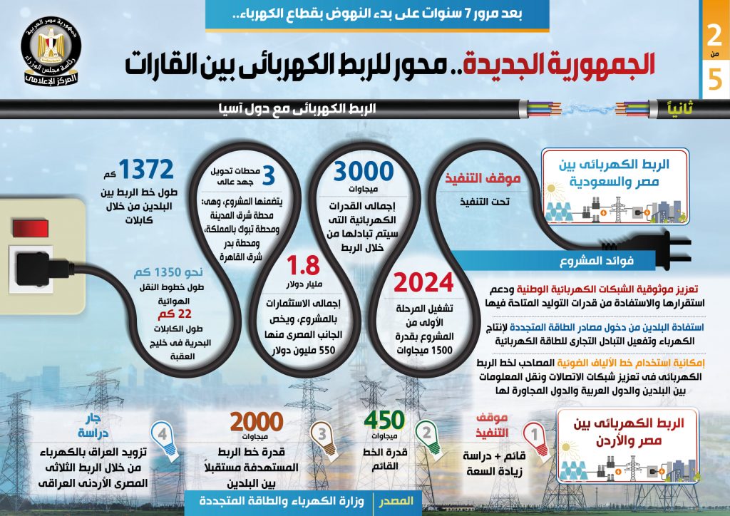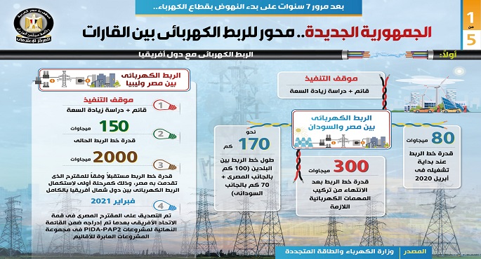 وفي هذا الصدد نشر المركز الإعلامي لمجلس الوزراء تقريراً تضمن إنفوجرافات تسلط الضوء على تحول مصر لمحور للربط الكهربائي بين القارات، وذلك بعد مرور 7 سنوات على بدء النهوض بقطاع الكهرباء.