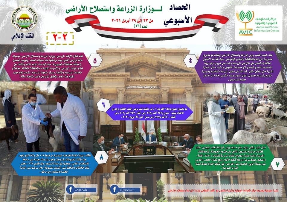 أصدر مركز المعلومات الصوتية والمرئية، التابع لوزارة الزراعة واستصلاح الاراضي، “الانفوجراف الاسبوعي” في نسخته رقم ٣٦، حول الحصاد الاسبوعي لأهم أنشطة الوزارة، خلال الاسبوع الماضي في الفترة من ٢٣ وحتى ٢٩ ابريل الجاري، وذلك بالتعاون مع المكتب الاعلامي للوزارة.