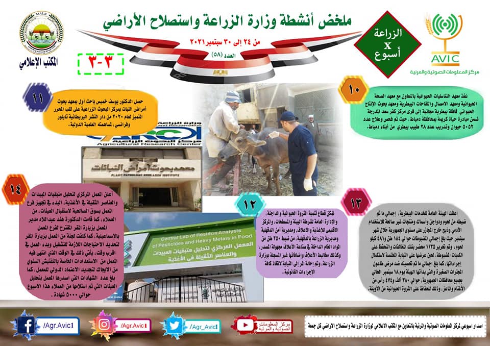 بالإنفوجراف .. الحصاد الأسبوعي لأنشطة وزارة الزراعة في الفترة من ٢٤ إلى ٣٠ سبتمبر