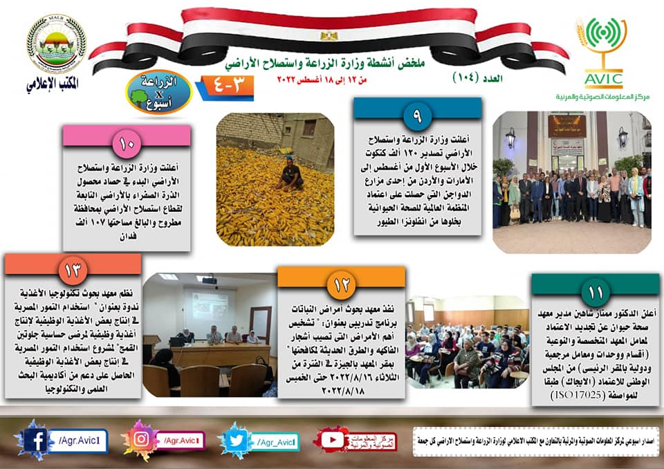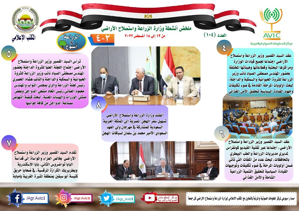 بالإنفوجراف .. الحصاد الأسبوعي لأنشطة وزارة الزراعة في الفترة من ١٢ وحتى ١٨ أغسطس الجاري