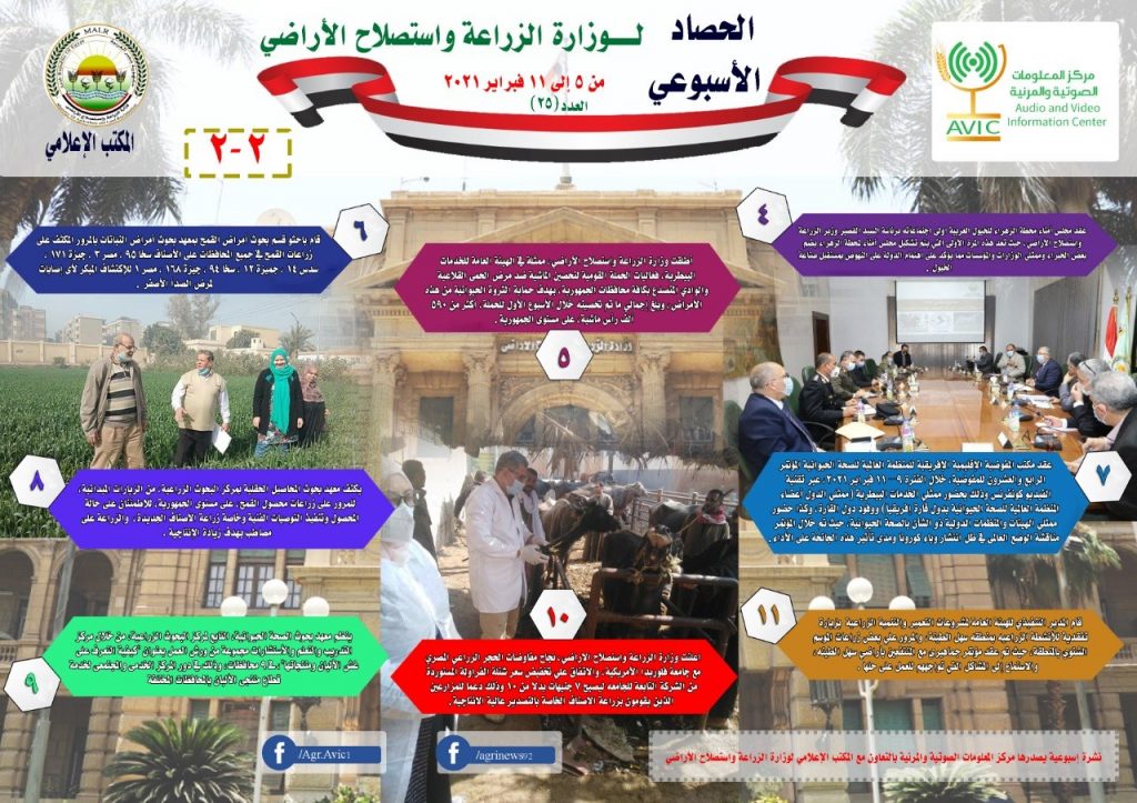 أصدر مركز المعلومات الصوتية والمرئية، التابع لوزارة الزراعة واستصلاح الاراضي، “الانفوجراف الاسبوعي” في نسخته رقم 25، حول الحصاد الاسبوعي لأهم أنشطة الوزارة، خلال الاسبوع الماضي في الفترة من 5 حتى 11 فبراير الجاري وذلك بالتعاون مع المكتب الاعلامي للوزارة.