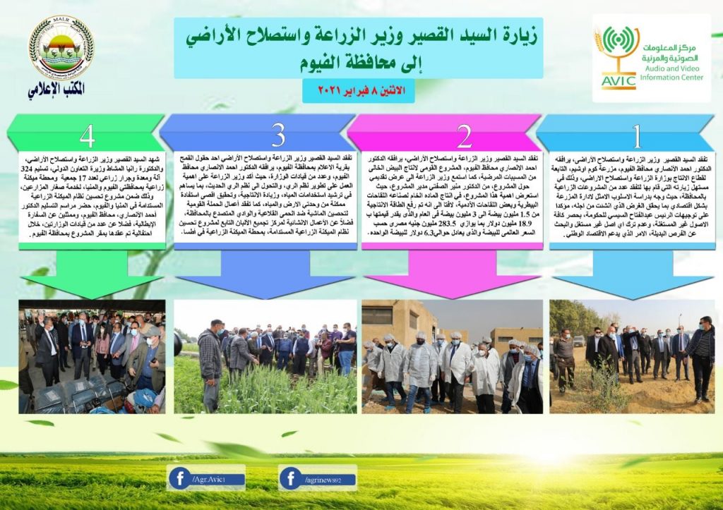 وفي سياق متصل سلط الحصاد هذا الاسبوع الضوء على زيارة السيد القصير وزير الزراعة واستصلاح الأراضي، الى محافظة الفيوم، والتي شملت عددا من الانشطة الهامة، ومتابعة عددا من المشروعات الزراعية بالمحافظة، حيث تفقد وزير الزراعة يرافقه محافظ الفيوم، مزرعة كوم اوشيم، التابعة لقطاع الانتاج، كما تفقدا المشروع القومى لانتاج البيض الخالى من المسببات المرضية، كذلك احد حقول القمح بقرية الاعلام، فضلا عن أعمال الحملة القومية لتحصين الماشية ضد الحمى القلاعية والوادي المتصدع بالمحافظة، اضافة الى الأعمال الانشائية لمركز تجميع الألبان التابع لمشروع تحسين نظام الميكنة الزراعية المستدامة، بمحطة الميكنة الزراعية في أطسا.