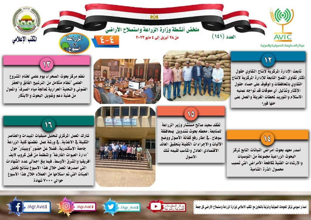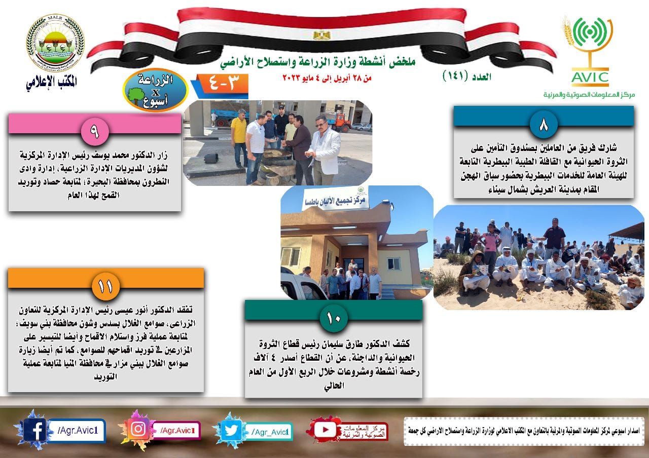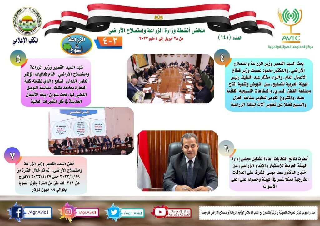 أصدر مركز المعلومات الصوتية والمرئية، التابع لوزارة الزراعة واستصلاح الاراضي، “الانفوجراف الاسبوعي” في نسخته رقم ١٤١ ، حول الحصاد الاسبوعي لأهم أنشطة الوزارة، خلال الاسبوع الماضي في الفترة من ٢٨ ابريل وحتى ٤ مايو الجاري، وذلك بالتعاون مع المكتب الاعلامي للوزارة، كما أصدر المركز ايضا ملخصا بالفيديو، حول انشطة الوزارة خلال نفس الفترة.