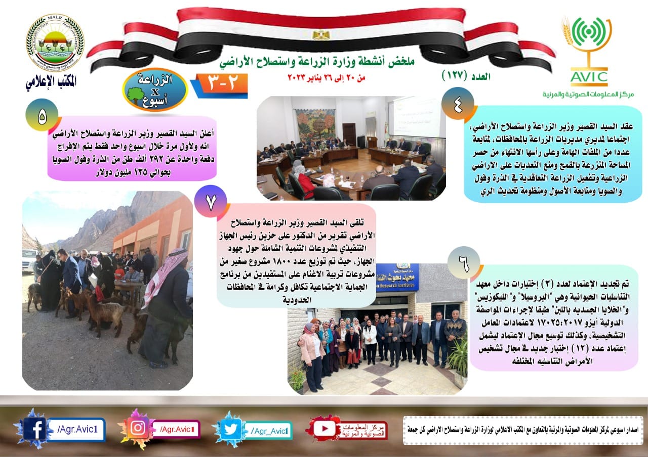 بالإنفوجراف .. الحصاد الإسبوعي لأنشطة وزارة الزراعة في الفترة من ٢٠ إلى ٢٦ يناير الجاري