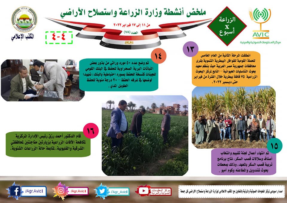 بالإنفوجراف .. الحصاد الإسبوعي لأنشطة وزارة الزراعة في الفترة من ١١ إلى ١٧ فبراير الجاري