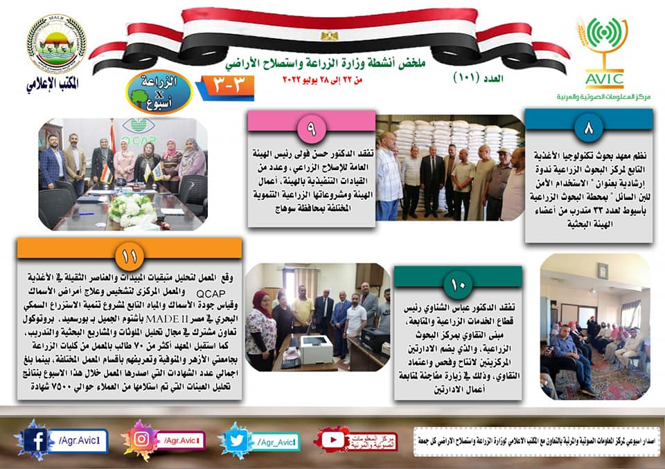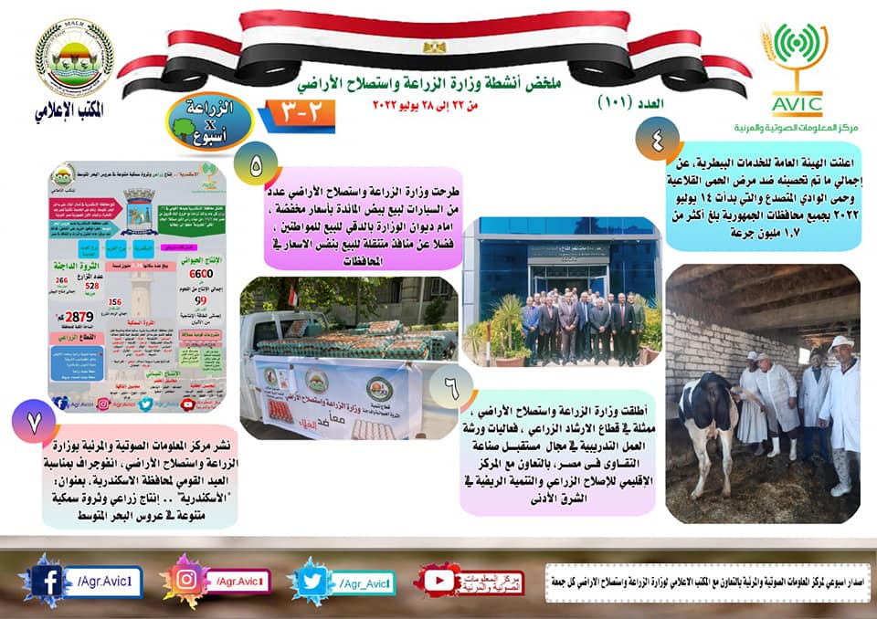 أصدر مركز المعلومات الصوتية والمرئية، التابع لوزارة الزراعة واستصلاح الأراضي، “الانفوجراف الأسبوعي” في نسخته رقم ١٠١ ، حول الحصاد الأسبوعي لأهم أنشطة الوزارة، خلال الأسبوع الماضي في الفترة من ٢٢ وحتى ٢٨ يوليو الجاري، وذلك بالتعاون مع المكتب الإعلامي للوزارة، كما أصدر المركز أيضا ملخصا بالفيديو، حول أنشطة الوزارة خلال نفس الفترة.