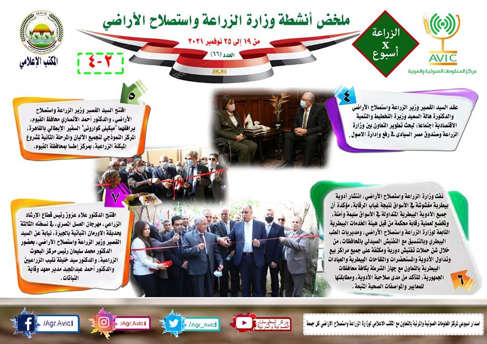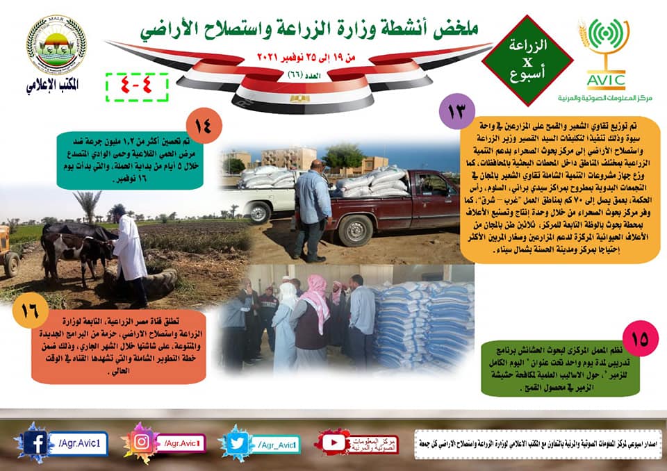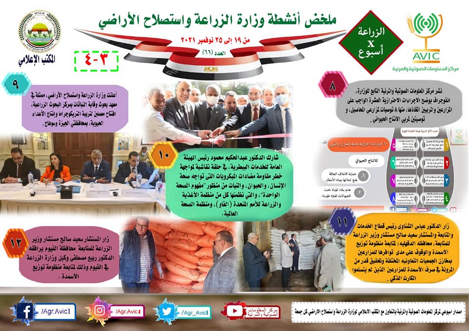 بالإنفوجراف .. الحصاد رقم ٦٦ لأنشطة وزارة الزراعة في الفترة من ١٩ إلى ٢٥ نوفمبر الجاري