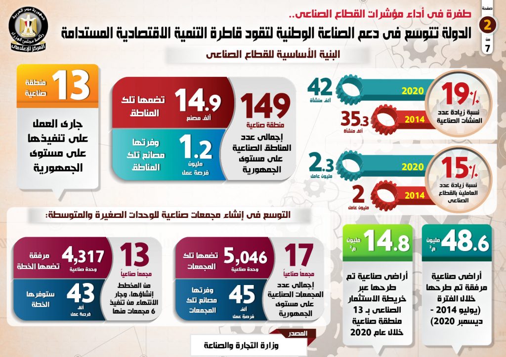 وفيما يتعلق بالبنية الأساسية للقطاع الصناعي، أشار التقرير إلى زيادة عدد المنشآت الصناعية بنسبة 19%، حيث وصلت لـ 42 ألف منشأة عام 2020 مقارنة بـ 35.3 ألف منشأة عام 2014، في حين زاد عدد العاملين بالقطاع الصناعي بنسبة 15% حيث وصل لـ 2.3 مليون عامل عام 2020 مقارنة بـ 2 مليون عامل عام 2014.