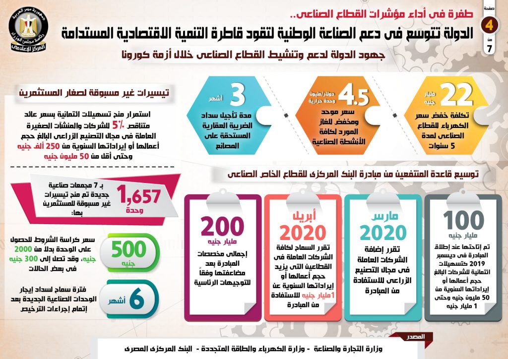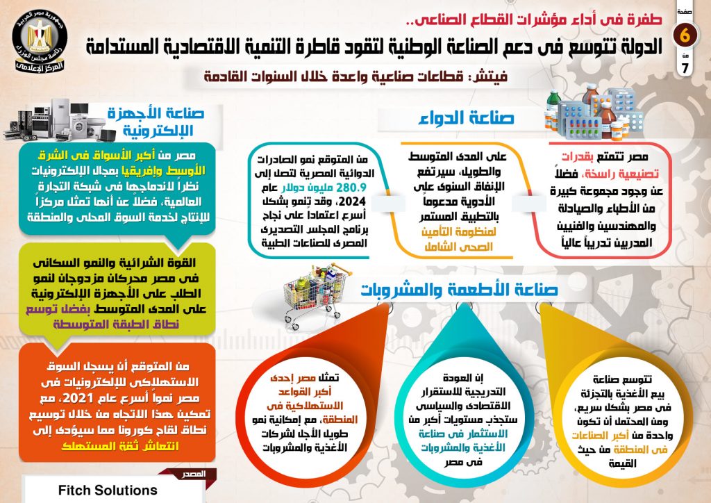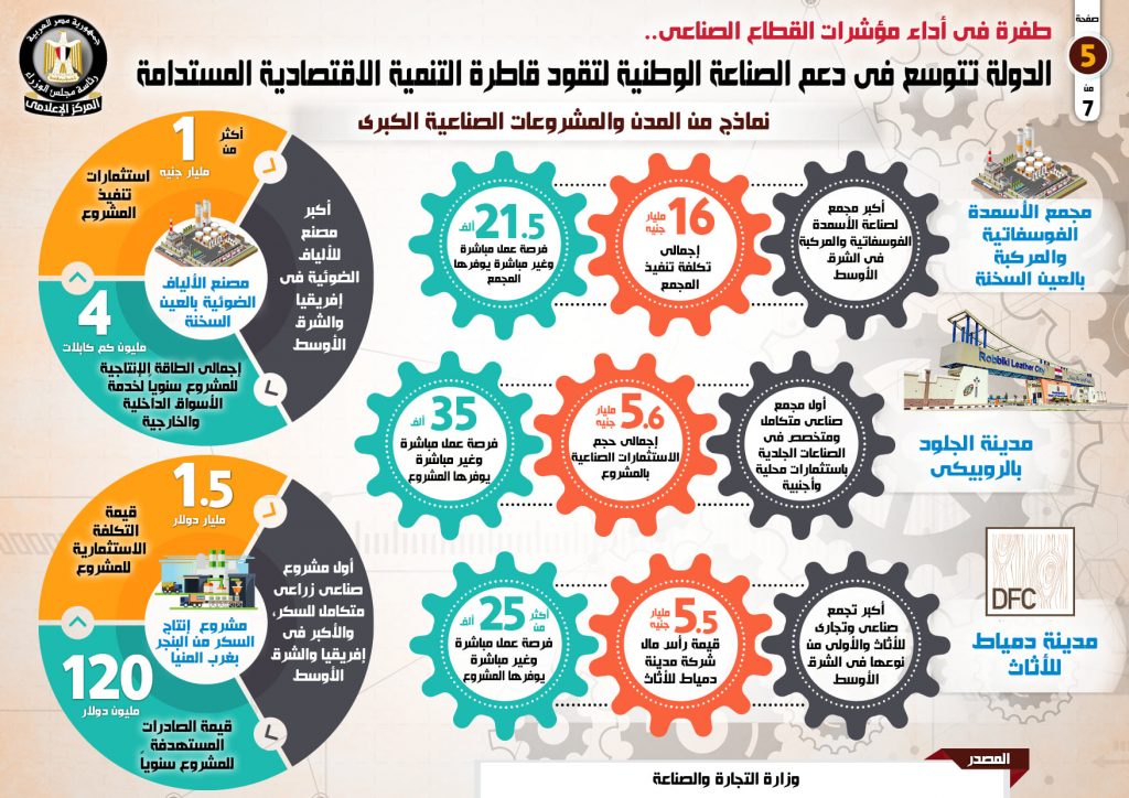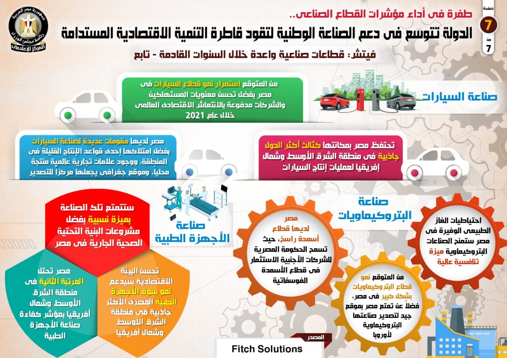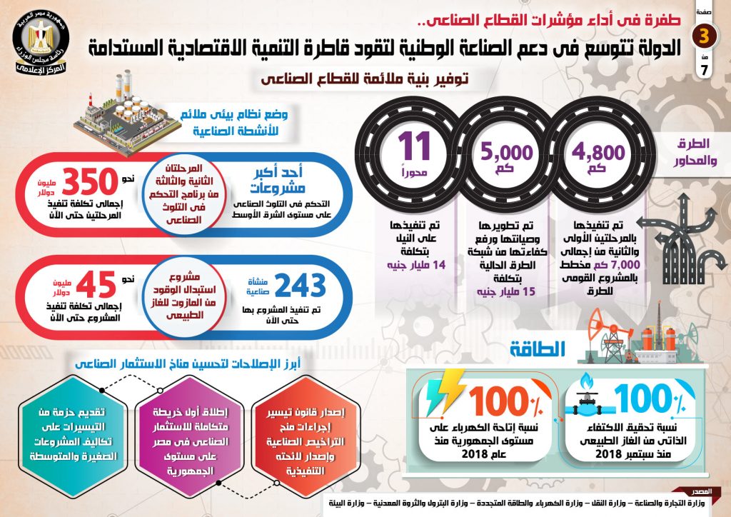 وفي هذا الصدد، نشر المركز الإعلامي لمجلس الوزراء، تقريراً تضمن إنفوجرافات تسلط الضوء على توسع الدولة في دعم الصناعة الوطنية لتقود قاطرة التنمية الاقتصادية المستدامة.