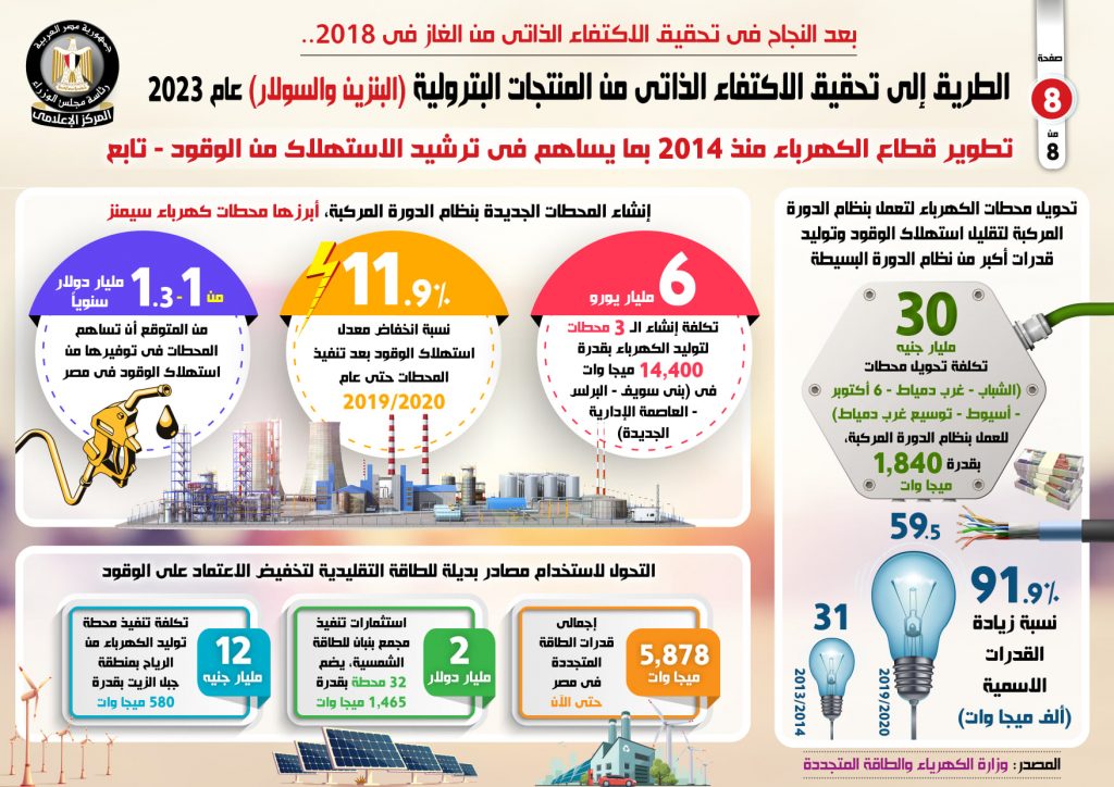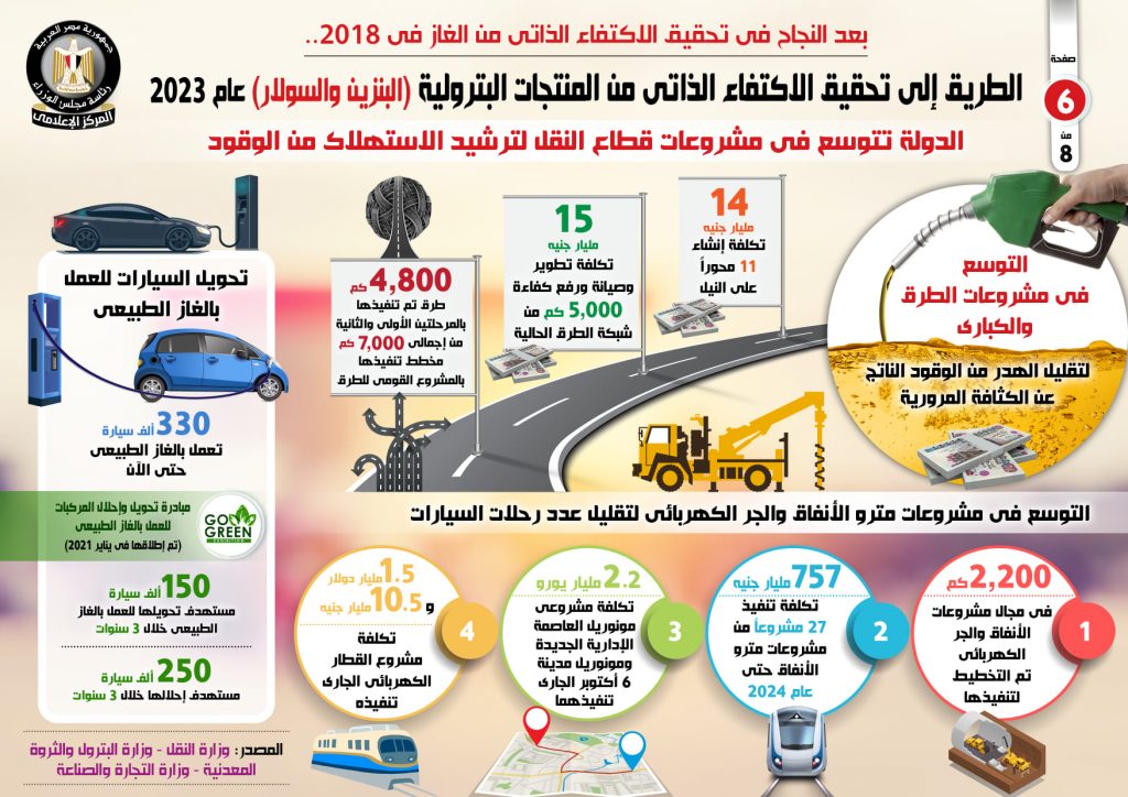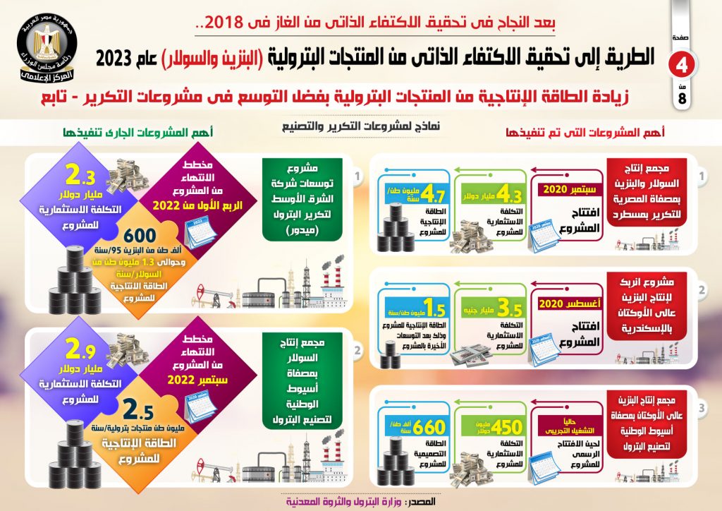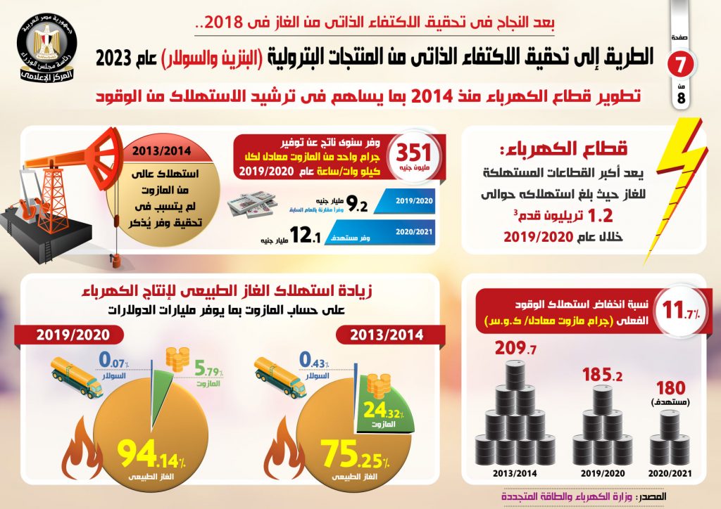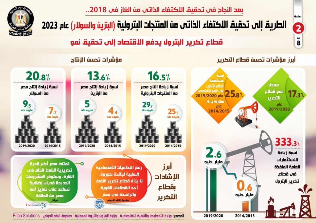 وفي هذا الصدد، أصدر المركز الإعلامي لمجلس الوزراء، تقريراً شمل إنفو جرافات تسلط الضوء على وصول مصر إلى الطريق لتحقيق الاكتفاء الذاتي من المنتجات البترولية (البنزين والسولار) عام 2023، وذلك بعد النجاح في تحقيق الاكتفاء الذاتي من الغاز في عام 2018.