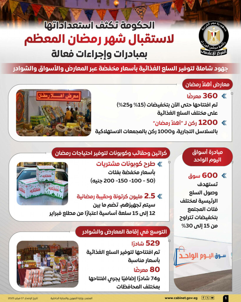 وعلى صعيد متصل، يجري تجهيز 2.5 مليون كرتونة وحقيبة رمضانية، تضم ما بين 12 إلى 15 سلعة أساسية، اعتبارًا من مطلع فبراير، بالإضافة إلى طرح كوبونات مشتريات بأسعار مخفضة بفئات “50 – 100 – 150 – 200” جنيه.