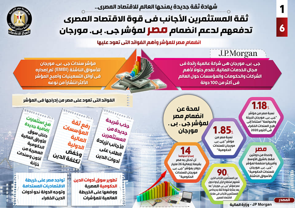 نشر المركز الإعلامي لمجلس الوزراء اليوم الثلاثاء تقريرا تضمن إنفوجرافات تسلط الضوء على انضمام مصر لمؤشر جي بي مورجان بدعم من ثقة المستثمرين الأجانب في قوة الاقتصاد المصري، وهو ما يعد بمثابة شهادة ثقة جديدة من العالم.