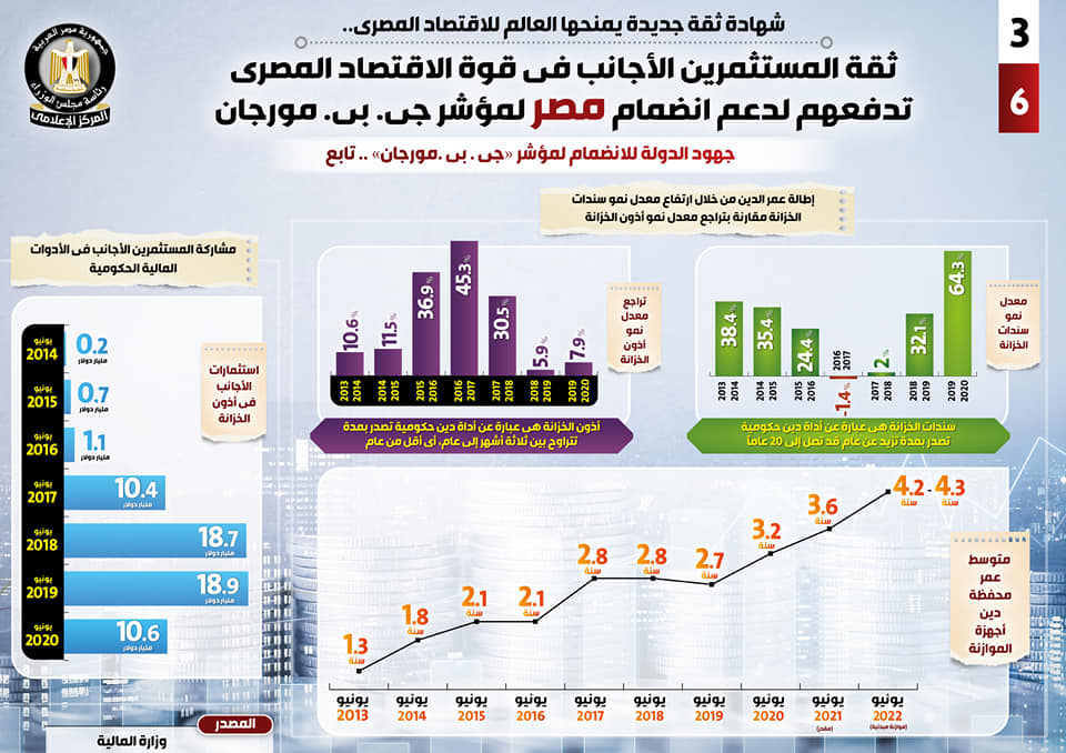 وإلى جانب ما سبق، تضمنت جهود الدولة للانضمام لمؤشر “جي. بي. مورجان” مشاركة المستثمرين الأجانب في الأدوات المالية الحكومية، لتبلغ استثماراتهم في أذون الخزانة 10.6 مليار دولار في يونيو 2020 مقارنة بـ 18.9 مليار دولار في يونيو 2019 و18.7 مليار دولار في يونيو 2018، و10.4 مليار دولار في يونيو 2017، و1.1 مليار دولار في يونيو 2016، و0.7 مليار دولار في يونيو 2015، و0.2 مليار دولار في يونيو 2014.