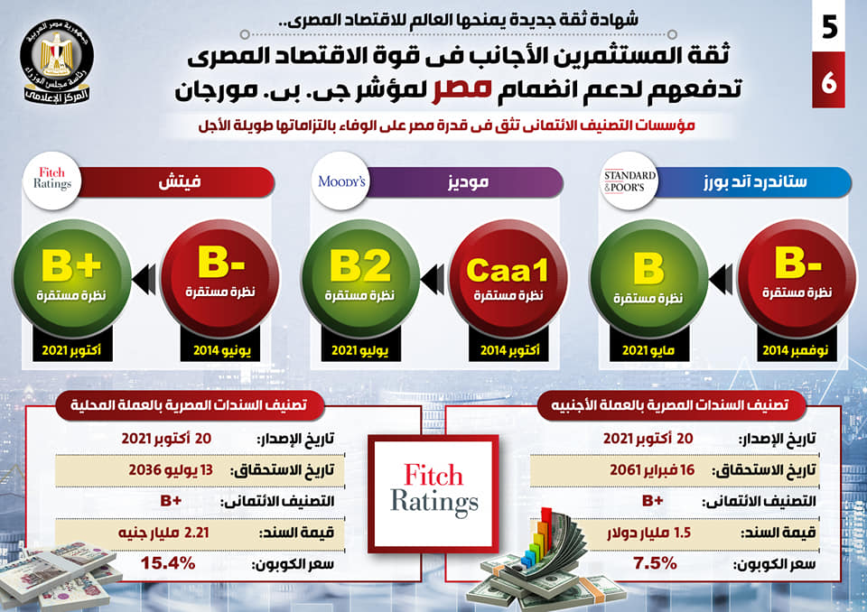 أما موديز فقد وضعت التصنيف الائتماني لمصر عند مستوى B2 مع نظرة مستقرة في يوليو 2021 مقارنة بتصنيفها Caa1 مع نظرة مستقرة في أكتوبر 2014، بينما وضعت فيتش التصنيف الائتماني لمصر عند مستوى B مع نظرة مستقرة في أكتوبر 2021مقارنة بـ -B مع نظرة مستقرة في يونيو 2014.