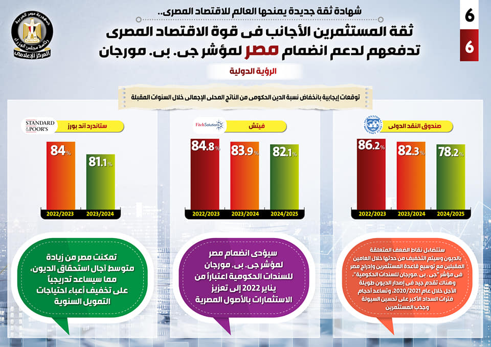 ومن جانبها، توقعت فيتش أن يؤدي انضمام مصر لمؤشر “جي. بي. مورجان للسندات الحكومية” اعتباراً من يناير 2022 إلى تعزيز الاستثمارات بالأصول المصرية، في حين أكدت ستاندرد آند بورز أن مصر تمكنت من زيادة متوسط آجال استحقاق الديون، مما سيساعد تدريجياً على تخفيف أعباء احتياجات التمويل السنوية.