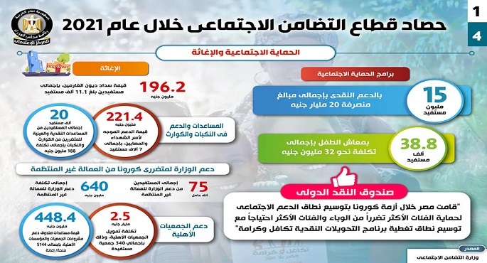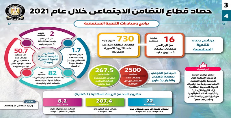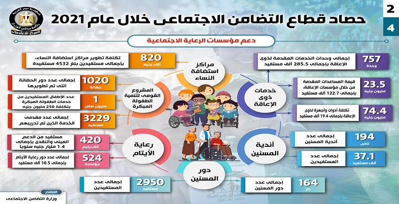 وفي إطار سلسلة تقارير حصاد قطاعات الدولة في عام 2021، نشر المركز الإعلامي لمجلس الوزراء تقريراً تضمن إنفو جرافات تسلط الضوء على حصاد قطاع التضامن الاجتماعي.