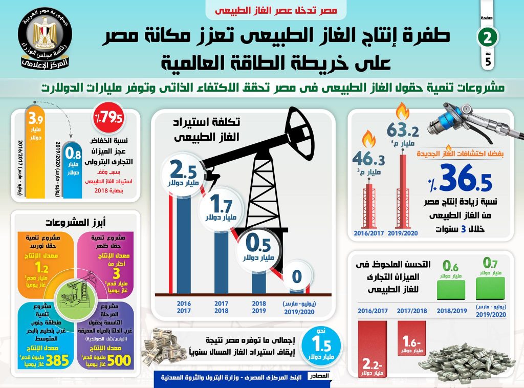 وفي هذا الصدد، نشر المركز الإعلامي لمجلس الوزراء، تقريراً شمل إنفوجرافات تسلط الضوء على الإنجازات المتحققة في قطاع الغاز الطبيعي التي أحدثت طفرة في الإنتاج مما أدى لتحقيق الاكتفاء الذاتي منه والبدء في عمليات التصدير.