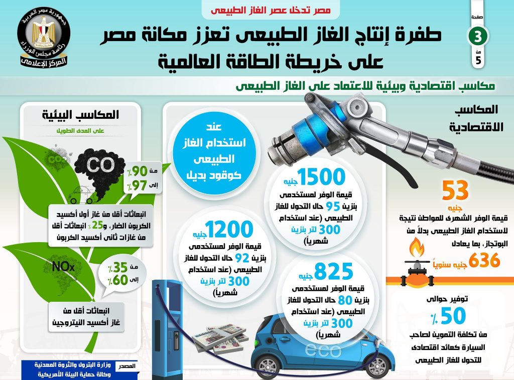 واستعرض التقرير أهم المكاسب الاقتصادية للاعتماد على الغاز الطبيعي كوقود بديل، والتي تتمثل في توفير 53 جنيهاً شهرياً للمواطن نتيجة استخدام الغاز الطبيعي بدلاً من البوتاجاز بما يعادل 636جنيهاً سنوياً، بالإضافة إلى توفير حوالي 50% من تكلفة التموين لصاحب السيارة كعائد اقتصادي للتحول للغاز الطبيعي.