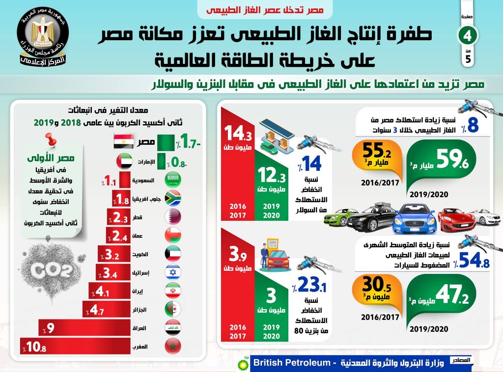 يأتي ذلك، بينما احتلت مصر وفقاً لبريتش بتروليم المركز الثالث كأكثر الدول تحقيقاً لزيادة في إنتاج الغاز الطبيعي على مستوى الدول المنتجة في شمال أفريقيا والشرق الأوسط عام 2019، وذلك بنسبة زيادة تصل لـ 10.9% مقارنة بعام 2018، بينما جاءت ليبيا في المركز الثاني بنسبة زيادة في إنتاجها من الغاز الطبيعي تصل لـ 14%، في حين حصلت البحرين على المركز الأول مسجلةً 15.4%.