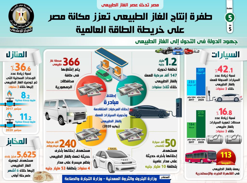 وعلى صعيد الجهود التي بذلتها الدولة لتحويل المركبات للعمل بالغاز الطبيعي، أظهر التقرير ارتفاع عدد السيارات المحولة للعمل بالغاز الطبيعي بنسبة 42.1% خلال 3 سنوات، حيث تم تحويل نحو 331 ألف سيارة للعمل بالغاز الطبيعي بنهاية سبتمبر 2020، مقارنة بـ 233 ألف سيارة بنهاية سبتمبر 2017، كما ارتفع عدد محطات تموين السيارات بالغاز الطبيعي بنسبة 16.8% خلال3 سنوات ليصل إلى 215 محطة بنهاية سبتمبر 2020، مقارنة بـ 184محطة بنهاية سبتمبر 2017، هذا بالإضافة إلى تشغيل 113 أتوبيساً يعمل بالغاز الطبيعي في القاهرة الكبرى والإسكندرية.