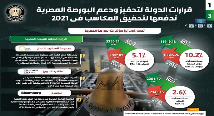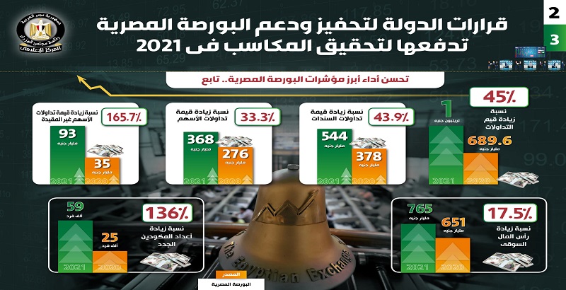 جاء ذلك في التقرير الذي نشره المركز الإعلامي لمجلس الوزراء تضمن إنفوجرافات تسلط الضوء على المكاسب التي حققتها البورصة المصرية في عام 2021 بفضل القرارات التي اتخذتها الدولة لتحفيزها ودعمها.