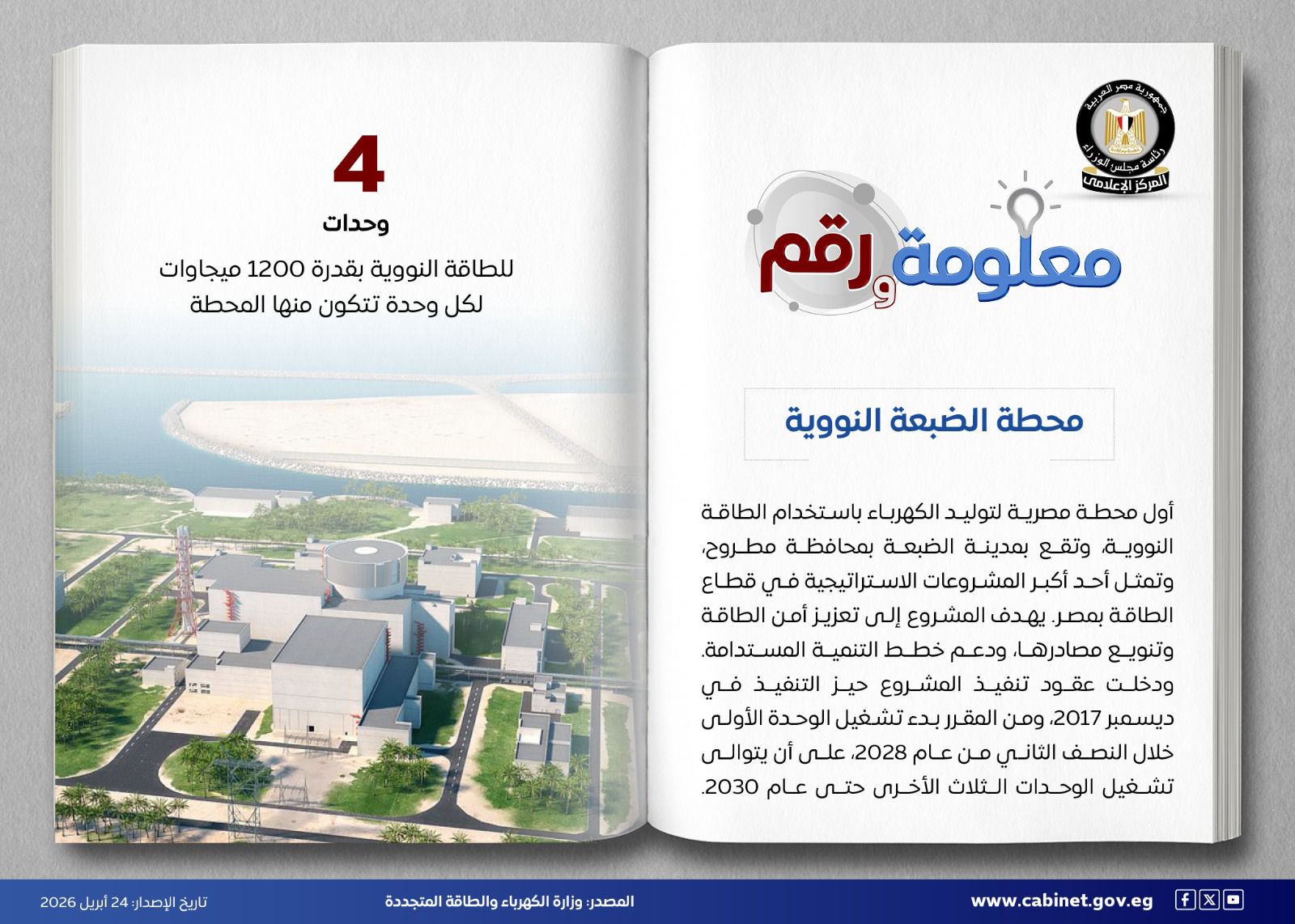 استعرض المركز الإعلامى لمجلس الوزراء أهمية مشرةع محطة الضبعة النووية حيث تجسد الحلم المصري في هذا المشروع باعتباره أول محطة مصرية لتوليد الكهرباء بالطاقة النووية، التي تمضي بثبات نحو المستقبل كأحد أكبر المشروعات الاستراتيجية للدولة.