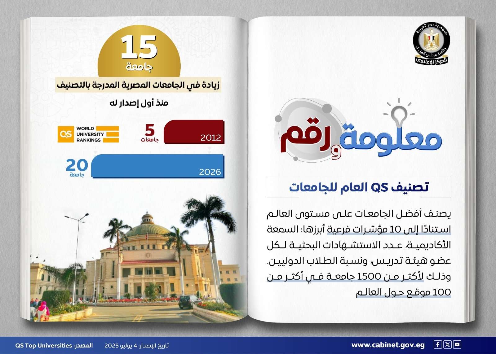 بالإنفوجراف.. مجلس الوزراء: مصر تنجح فى زيادة عدد الجامعات المصرية المدرجة بتصنيف QS العام للجامعات