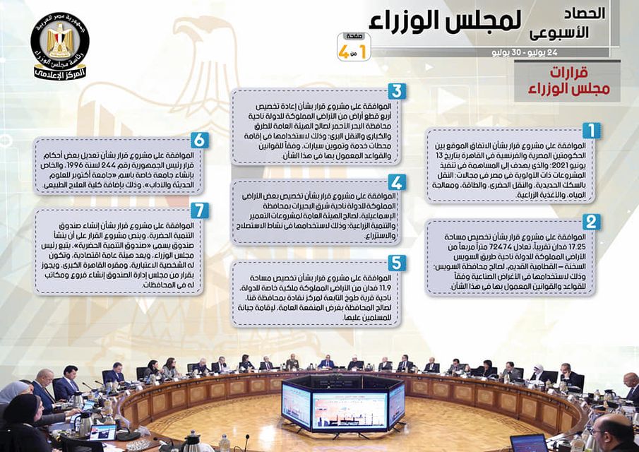وجاء في التقرير أنه تم إصدار عدد من القرارات، تشمل الموافقة على مشروع قرار بشأن الاتفاق الموقع بين الحكومتين المصرية والفرنسية في القاهرة بتاريخ 13 يونيو 2021؛ والذي يهدف إلى المساهمة في تنفيذ المشروعات ذات الأولوية فى مصر في مجالات: النقل بالسكك الحديدية، والنقل الحضري، والطاقة، ومعالجة المياه، والأغذية الزراعية، بالإضافة إلى الموافقة على مشروع قرار بشأن تخصيص مساحة 17.25 فدان تقريباً، تعادل 72474 متراً مربعاً من الأراضي المملوكة للدولة ناحية طريق السويس السخنة – القطامية القديم، لصالح محافظة السويس؛ وذلك لاستخدامها في الأغراض الصناعية وفقاً للقواعد والقوانين المعمول بها في هذا الشأن، فضلاً عن الموافقة على مشروع قرار بشأن إعادة تخصيص أربع قطع أراض من الأراضي المملوكة للدولة ناحية محافظة البحر الأحمر لصالح الهيئة العامة للطرق والكباري والنقل البري؛ وذلك لاستخدامها في إقامة محطات خدمة وتموين سيارات، وفقاً للقوانين والقواعد المعمول بها فى هذا الشأن، وكذلك الموافقة على مشروع قرار بشأن تخصيص بعض الأراضي المملوكة للدولة ناحية شرق البحيرات بمحافظة الإسماعيلية، لصالح الهيئة العامة لمشروعات التعمير والتنمية الزراعية؛ وذلك لاستخدامها في نشاط الاستصلاح والاستزراع.