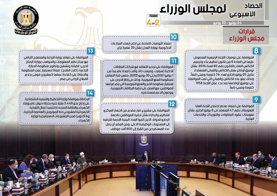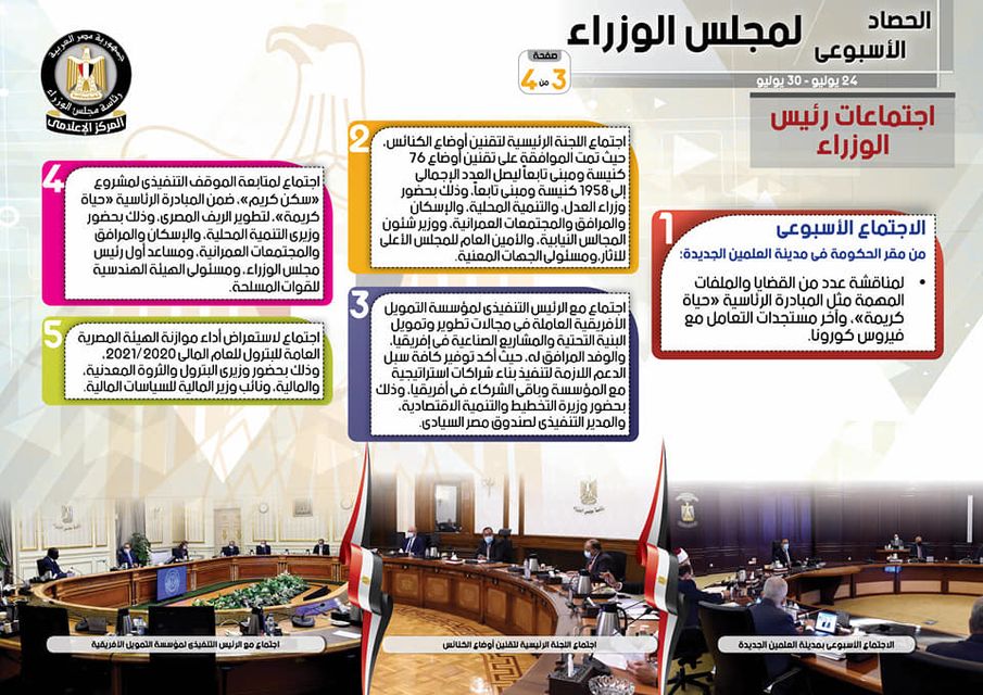 نشر المركز الإعلامي لمجلس الوزراء، تقريراً شمل إنفوجرافات سلط من خلالها الضوء على الحصاد الأسبوعي لمجلس الوزراء، وذلك خلال الفترة من 24حتى 30 يوليو 2021، والذي تضمن الموافقة على عدد من القرارات، فضلاً عن الاجتماعات واللقاءات التي عقدها الدكتور مصطفى مدبولي، رئيس مجلس الوزراء، بالإضافة إلى ما قام به سيادته من أنشطة.