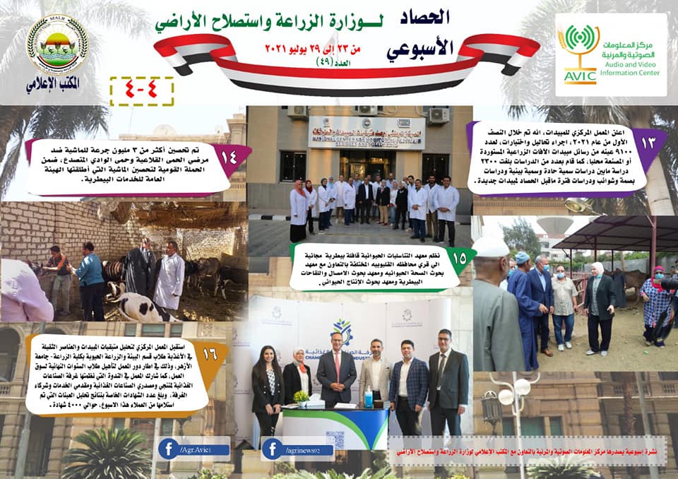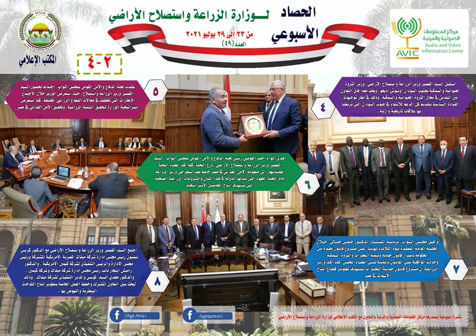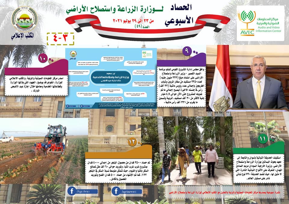 أصدر مركز المعلومات الصوتية والمرئية، التابع لوزارة الزراعة واستصلاح الأراضي، “الانفوجراف الأسبوعي” في نسخته رقم ٤٩، حول الحصاد الأسبوعي لأهم أنشطة الوزارة، خلال الأسبوع الماضي في الفترة من ٢٣ الى ٢٩ يوليو الجاري، وذلك بالتعاون مع المكتب الإعلامي للوزارة، كما أصدر المركز أيضا ملخصا بالفيديو، حول أنشطة الوزارة خلال نفس الفترة.