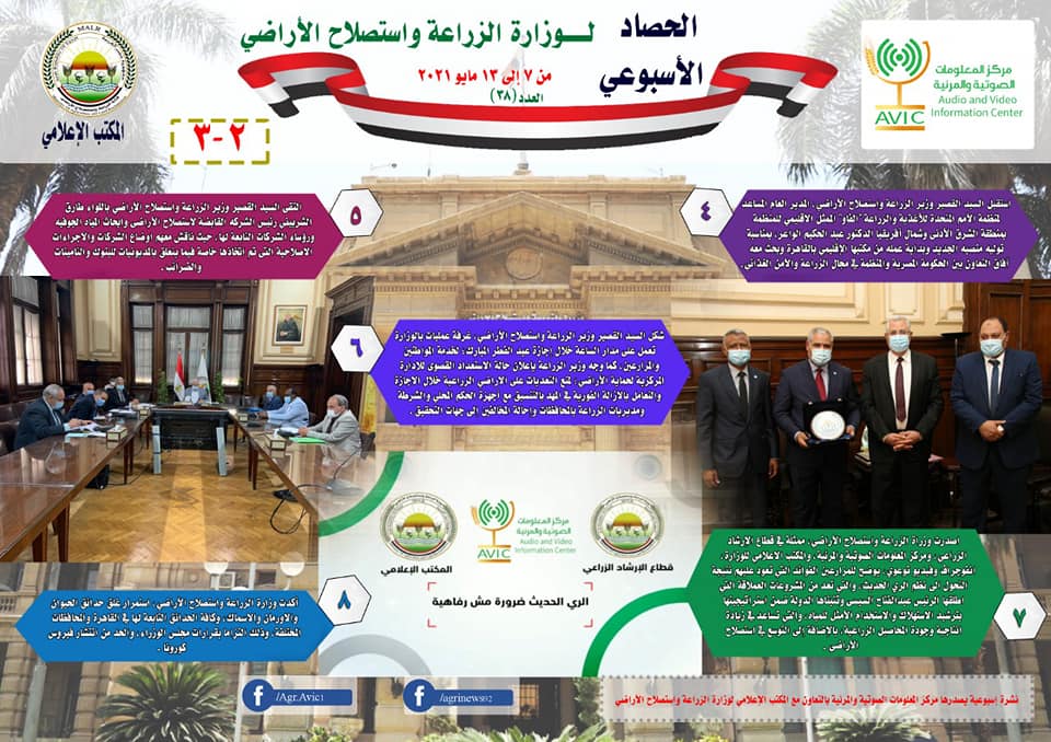 اصدر مركز المعلومات الصوتية والمرئية، التابع لوزارة الزراعة واستصلاح الاراضي، “الانفوجراف الاسبوعي” في نسخته رقم ٣٨، حول الحصاد الاسبوعي لأهم أنشطة الوزارة، خلال الاسبوع الماضي في الفترة من ٧ الى ١٣ مايو الجاري، وذلك بالتعاون مع المكتب الاعلامي للوزارة.