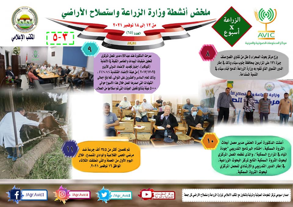 يذكر ان مركز المعلومات الصوتية والمرئية، بوزارة الزراعة واستصلاح الأراضي، والمكتب الاعلامي للوزارة، يصدران الجمعة من كل اسبوع، انفوجرافا وفيديو باسم: الزراعة في اسبوع، لالقاء الضوء على ملخص ما تم من انشطة وجهود، بكافة القطاعات والهيئات، التابعة للوزارة، فضلا عن انفوجراف وفيديو كل ثلاثاء باسم: الزراعة في كل مصر، حول انشطة وجهود القطاع الزراعي، بالمحافظات المختلفة.