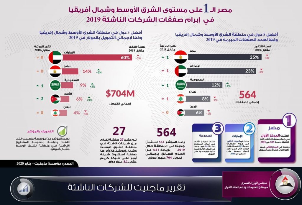 نشر مركز المعلومات ودعم اتخاذ القرار التابع لمجلس الوزراء انفوجرافا (رسوم توضيحية) يوضح أن مصر تحتل المركز الأول على مستوى الشرق الأوسط وشمال افريقيا في ابرام صفقات الشركات الناشئة 2019.