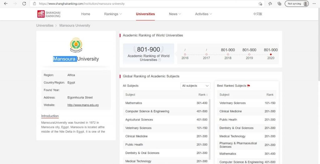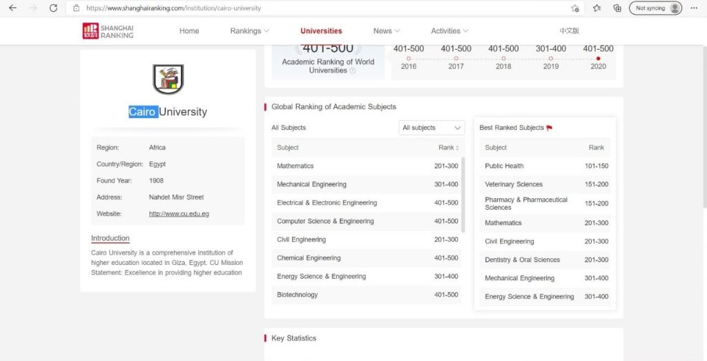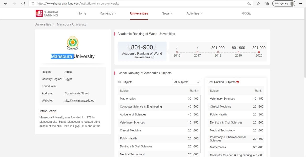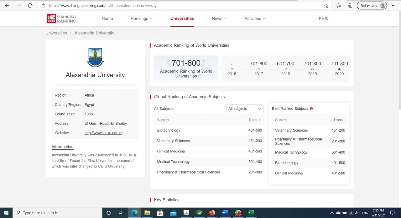 تلقى د. خالد عبد الغفار وزير التعليم العالى والبحث العلمى تقريراً حول إدراج خمس جامعات مصرية بتصنيف شنغهاي للعام ٢٠٢٠ وهي جامعات: القاهرة فى المركز (401-500)، يليها الإسكندرية (٧٠١-٨٠٠)، ثم عين شمس (٨٠١-٩٠٠)، المنصورة (٨٠١-٩٠٠)، الزقازيق (٩٠١-١٠٠٠).