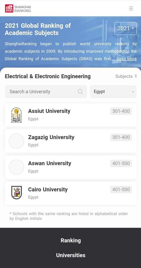 في الهندسة الكهربية: ظهرت جامعتا أسيوط والزقازيق فى المركز ( ٣٠١-٤٠٠)، وجامعتا أسوان والقاهرة فى المرتبة ( ٤٠١-٥٠٠).