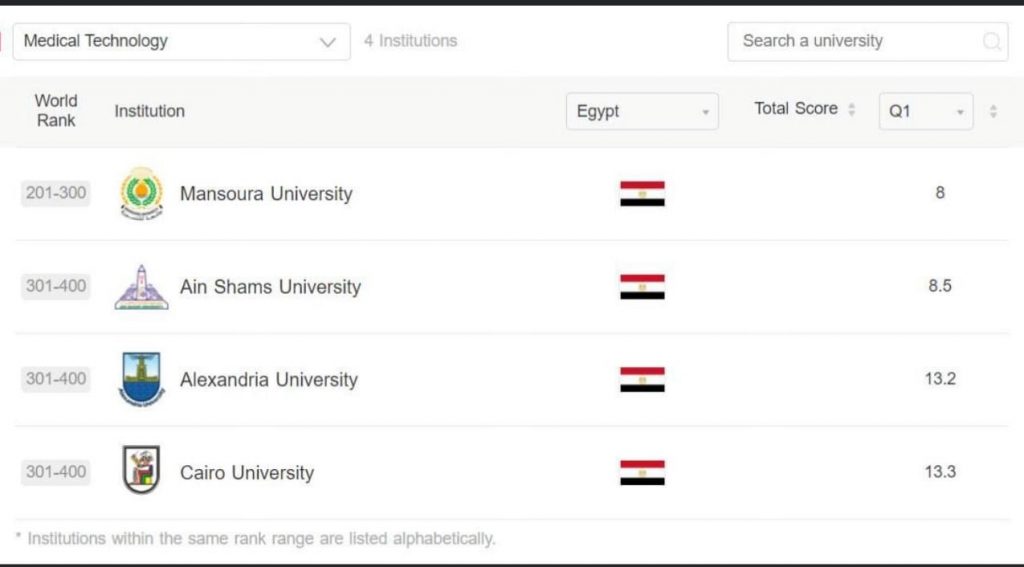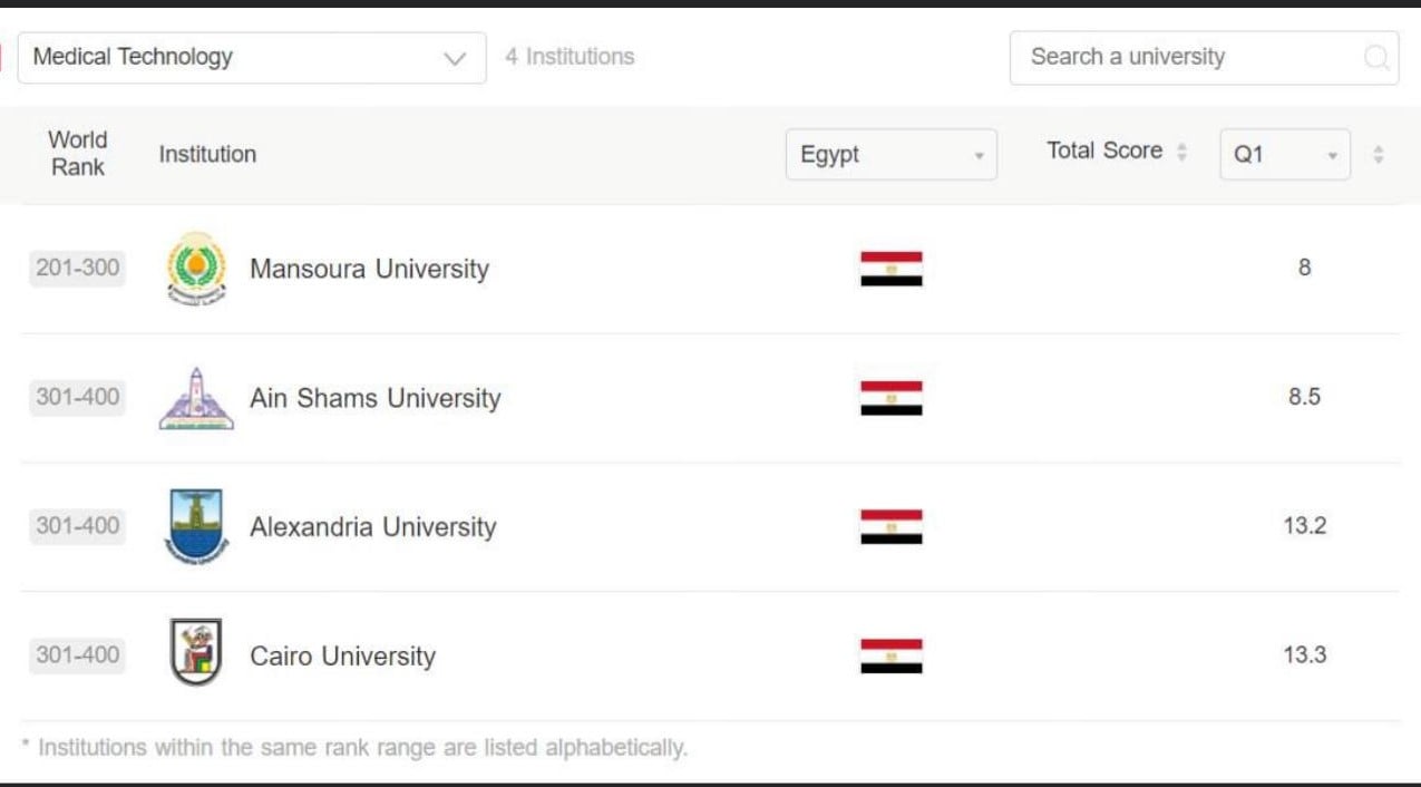 تكنولوجيا العلوم الطبية: تصدرت جامعة المنصورة الجامعات المصرية بحصولها على المرتبة (٢٠١-٣٠٠)، تليها ثلاث جامعات مصرية وهي: عين شمس والقاهرة والإسكندرية فى المركز (٣٠١-٤٠٠).