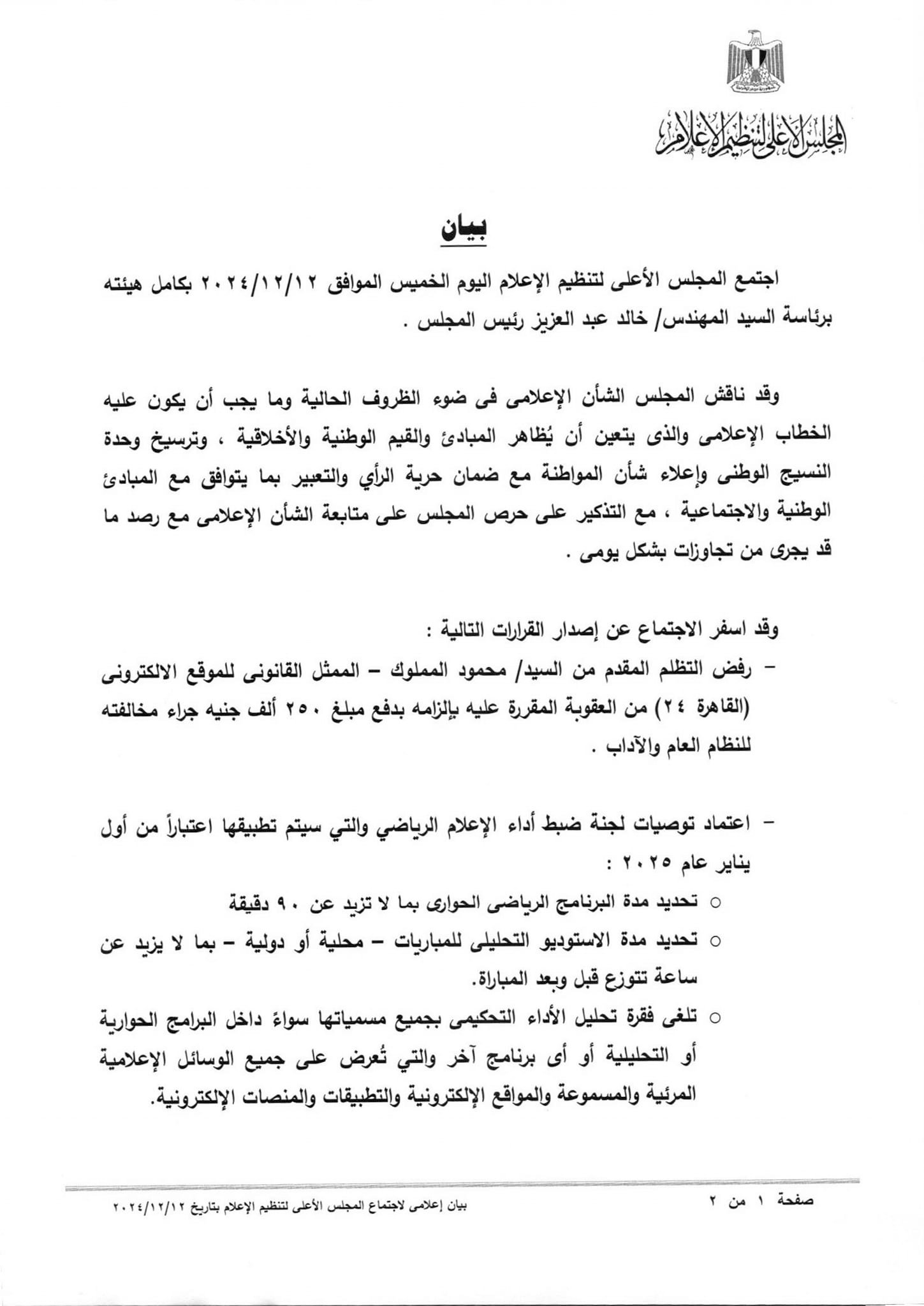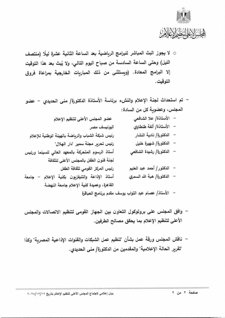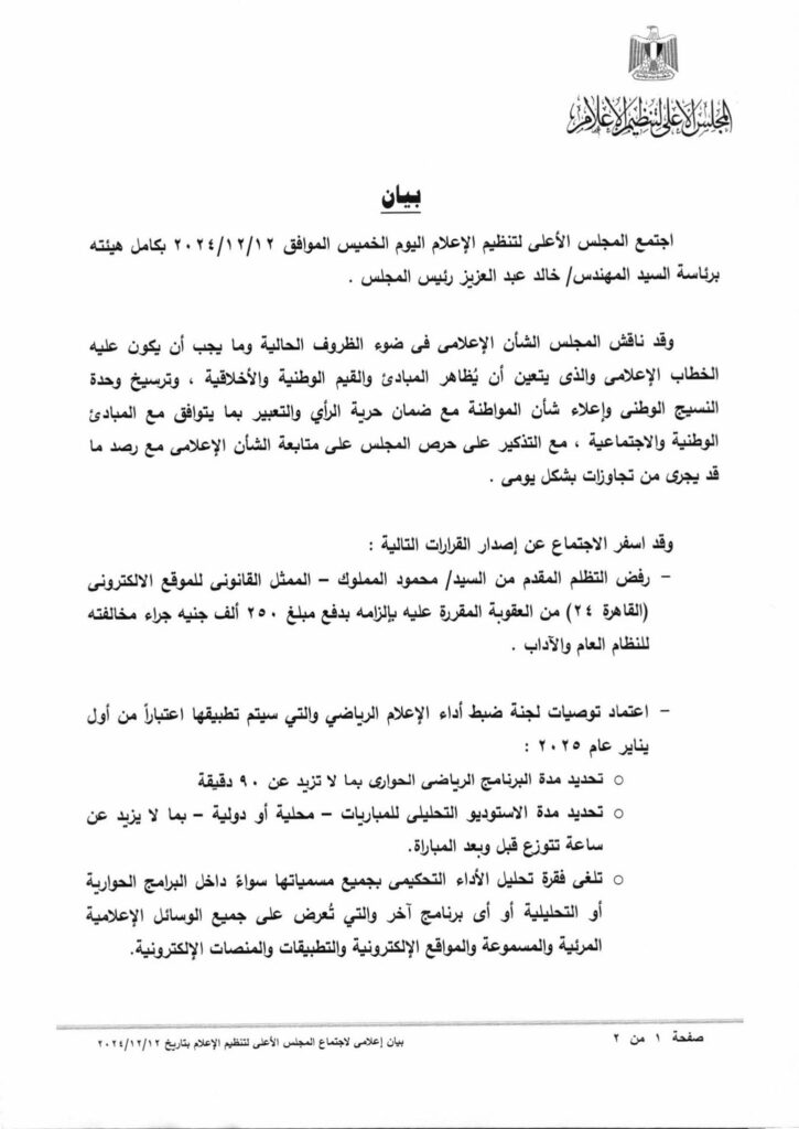 واعتمد المجلس الأعلى لتنظيم الإعلام، توصيات لجنة ضبط أداء الإعلام الرياضي والتي سيتم تطبيقها اعتباراً من أول يناير عام 2025، والتي جاءت كالتالي:
