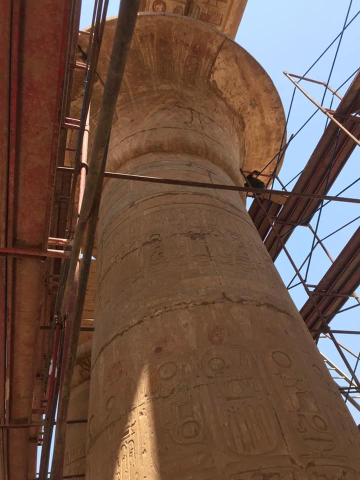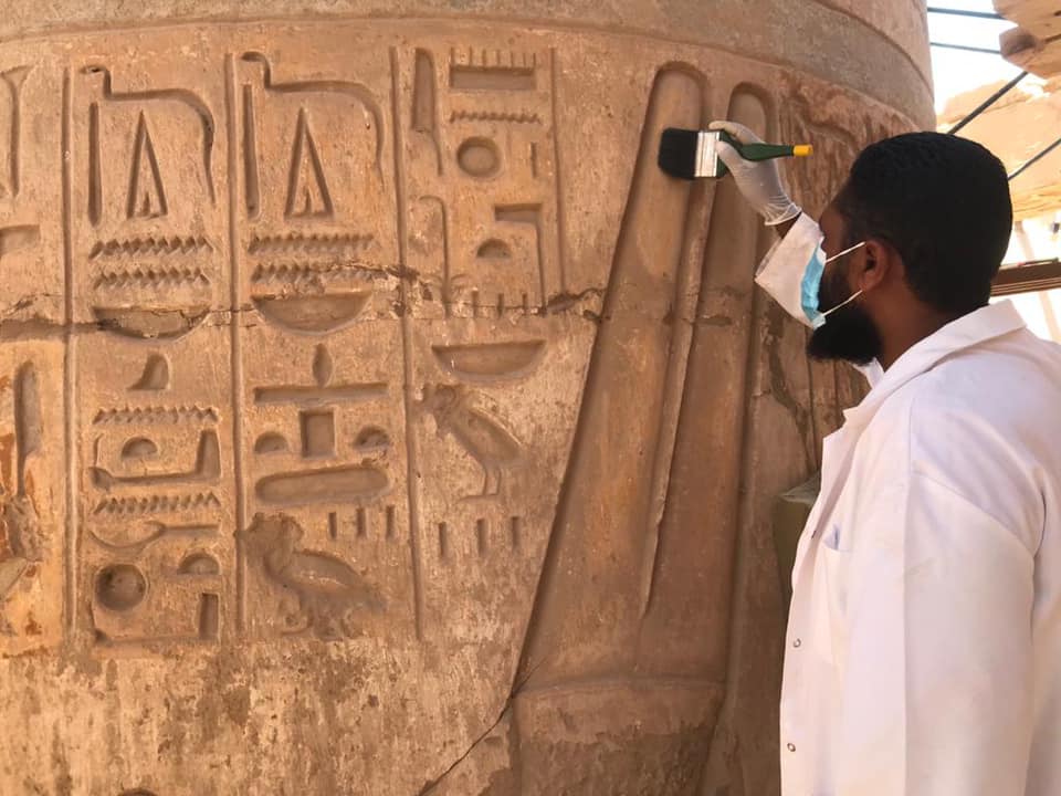 أنهي فريق الترميم من وزارة السياحة والآثار بالتعاون مع عدد من خريجي أقسام الترميم بجامعتي الأقصر وجنوب الوادي ، ومعهد الترميم بالأقصر من ترميم ما يقرب من 60%من أعمال ترميم العمود الأول بصالة الأعمدة الكبري بمعبد الكرنك وإظهار ألوانه الأصلية، وذلك بعد إزالة آثار التلف التي سببتها عوامل التعرية وجاري استكمال أعمال الترميم لبقية الأعمدة تباعا.