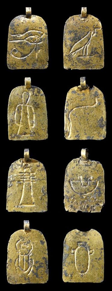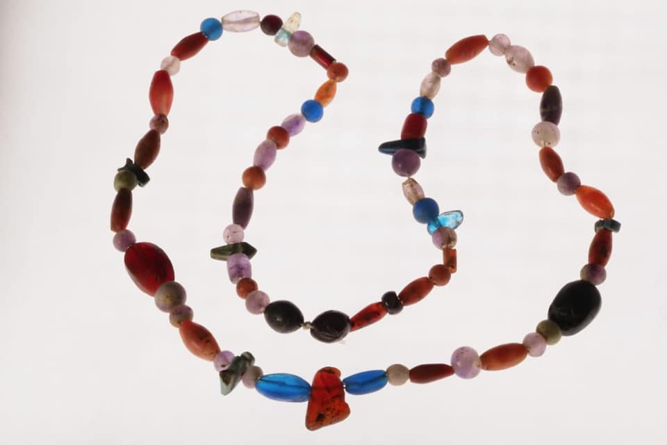 وأوضح أن القلادة الثالثة هي الأكثر جمالا ويبلغ طولها 61 سم، ومصنوعة من 74 قطعة تجمع بين حبات الامتيست والكورنيلي والكهرمان والزجاج الأزرق والكوارتز، وتحتوي على جعرانين واحد منهما علي هيئة الإله حورس و5 تمائم من القيشاني.. فيما تتكون القلادة الرابعة من عدة سلاسل من خرز القيشاني مرتبطة ببعضها البعض بحلقة تجمع بين جميع الخيوط.