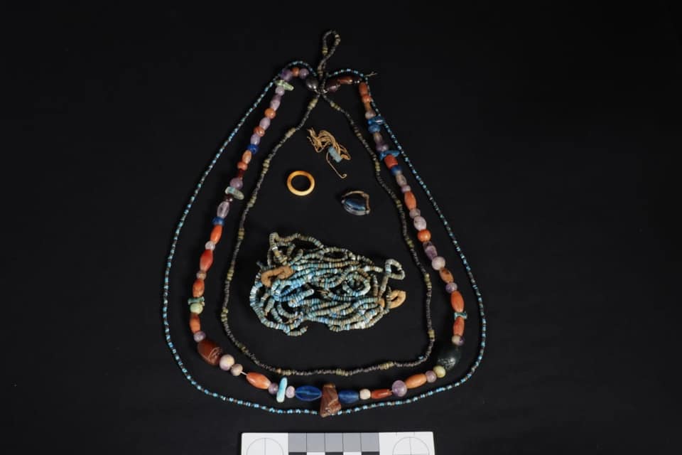 ومن جهته، أشار محمد عبدالبديع رئيس الإدارة المركزية لآثار مصر العليا إلى أن البعثة عثرت على 4 قلادات مربوطة ببعضها البعض بمشبك خزفي على صدر المومياء؛ القلادة الأولي يبلغ طولها 70 سم، وتتكون من خرز دائري مزخرف باللون الأزرق الداكن والفاتح، والقلادة الثانية طولها يبلغ 62 سم، ومصنوعة من القيشاني الأخضر والخرز الزجاجي.