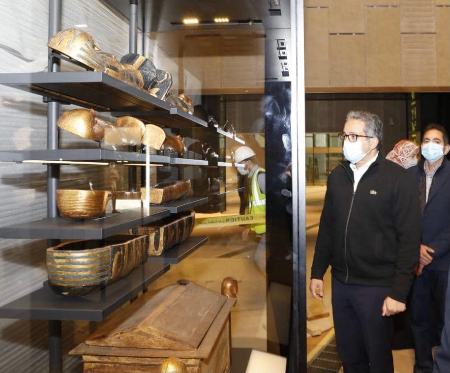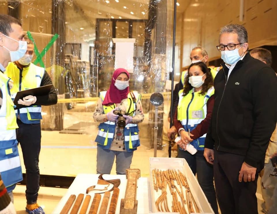 بالصور.. الآثار: بدء وضع أوائل القطع من مقتنيات توت عنخ آمون بفتارين العرض بالمتحف الكبير