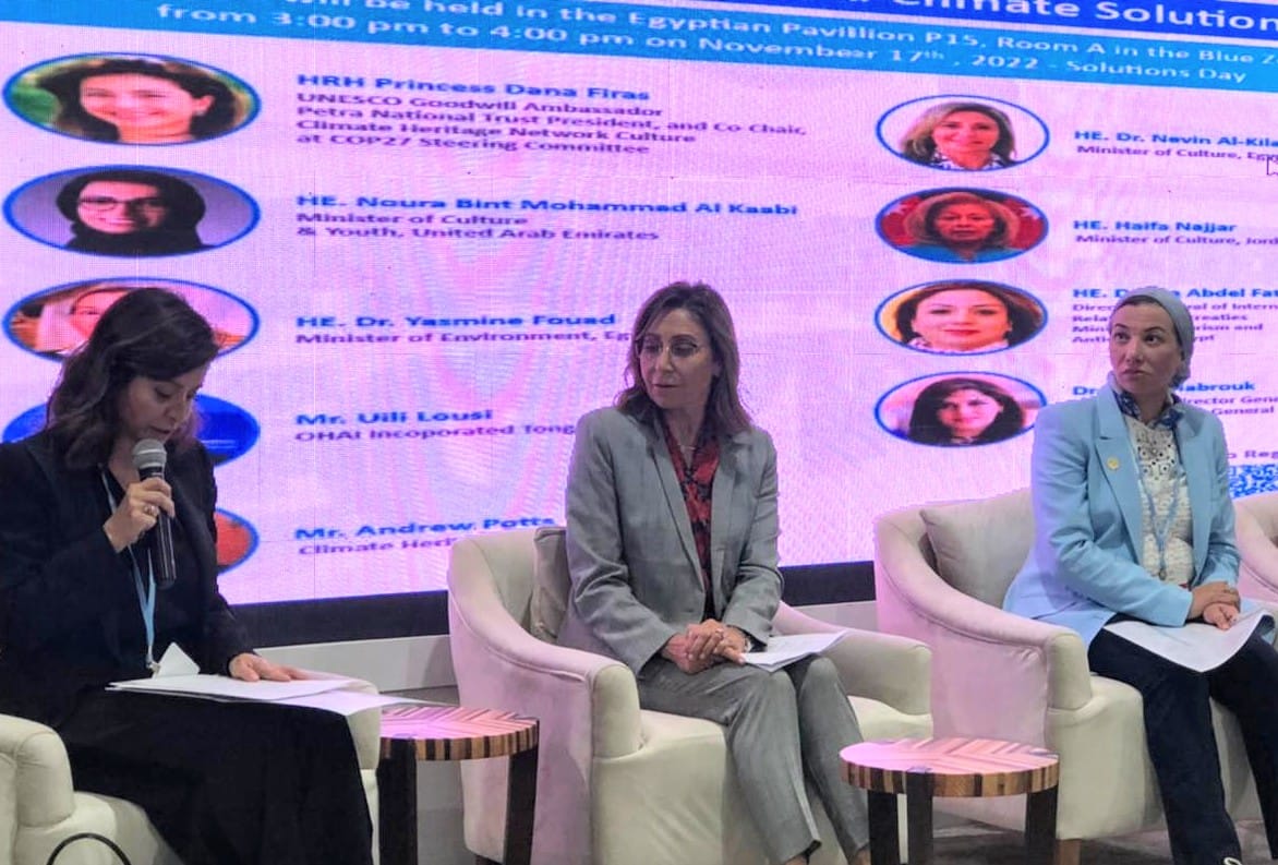 كما التقت وزيرة الثقافة، بالأميرة الأردنية ريم علي رئيس مؤسسة “آنا ليند”؛ لمناقشة سبل التعاون، وعدد من المشاريع ذات الاهتمام المشترك، كما شاركت في جلسة “شبكة التراث المناخي.. الحلول المناخية القائمة على التراث الثقافي”، بمشاركة الأميرة الأردنية “دانا فراس” سفيرة اليونسكو للنوايا الحسنة للتراث الثقافي، وزيرة البيئة الدكتورة ياسمين فؤاد، وزير البيئة الأردني معاوية الردايدة، مُنسق شبكة التراث الثقافي أندرو بوتس، كما شارك عن طريق تقنية الفيديو كل من، وزيرة الثقافة الأردنية هيفاء النجار، وزيرة الثقافة الإماراتية نورا الكعبي، وزير الثقافة الإيطالي جينارو ساينجليانو.