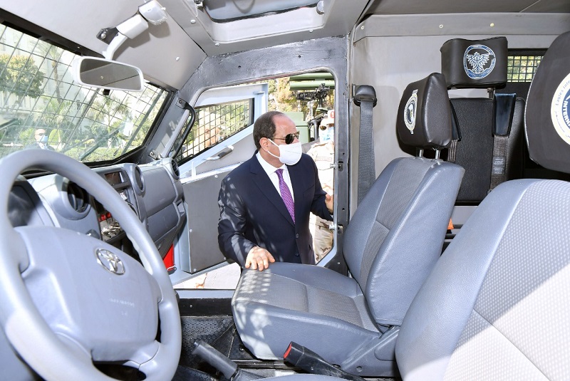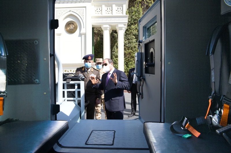 وصرح السفير بسام راضى، المتحدث الرسمى باسم رئاسة الجمهورية، بأن التفقد يأتى استمرارا لمتابعة الرئيس لأعمال التطوير لمنظومة العمل بالقوات المسلحة، واطلاعه على النماذج الحديثة من المركبات متعددة الاستخدامات والمجهزة لأعمال مكافحة الإرهاب وتأمين الجبهة الداخلية لعناصر القوات المسلحة والشرطة المدنية.