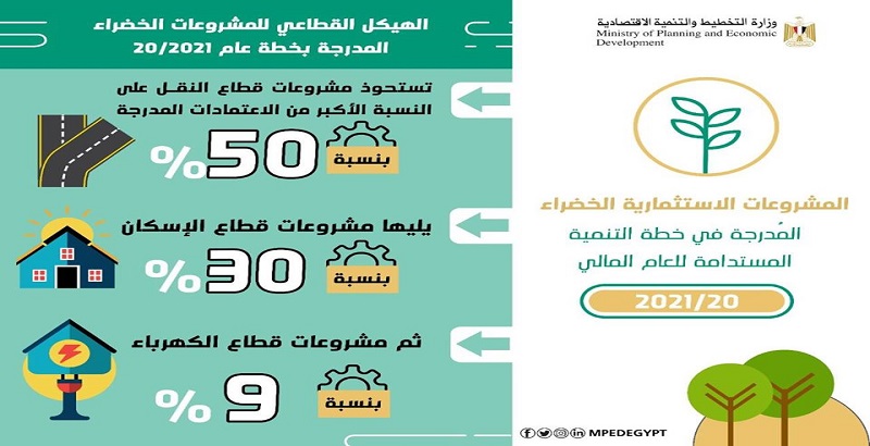 وحول الهيكل القطاعي للمشروعات الخضراء المدرجة في خطة عام 20/2021 أشار تقرير وزارة التخطيط والتنمية الاقتصادية، إلى أن مشروعات قطاع النقل تستحوذ على النسبة الأكبر من الإعتمادات المدرجة بخطة عام 20/2021 وذلك بنسبة 50%، يليها مشروعات قطاع الإسكان بنسبة 30%، ثم مشروعات قطاع الكهرباء بنسبة 9%.