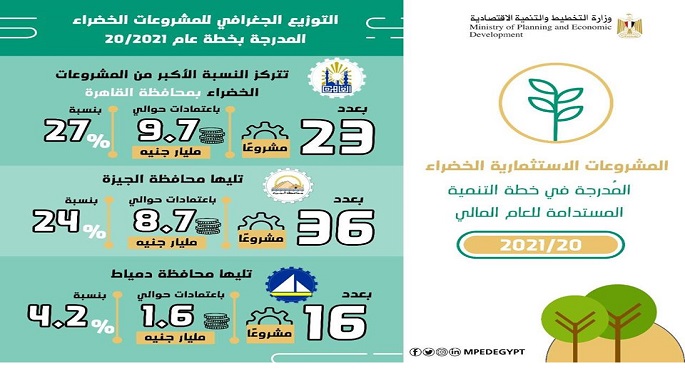 وفيما يخص التوزيع الجغرافي للمشروعات الخضراء المدرجة في خطة عام 20/2021 أشار التقرير إلى أن النسبة الأكبر من المشروعات الخضراء تتركز بمحافظة القاهرة بعدد مشروعات يبلغ 23 مشروعًا باعتمادات تبلغ نحو 9.7 مليار جنيه وبنسبة 27%، تليها محافظة الجيزة بـ 36 مشروعًا باعتمادات تبلغ 8.7 مليار جنيه وبنسبة 24%، وفي المركز الثالث تأتي محافظة دمياط بـ 16 مشروع باعتمادات تبلغ حوالي 1.6 مليار جنيه وبنسبة 4.2%.