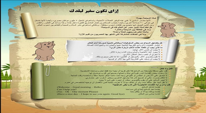 وأوضحت أنه نظرا لسعي الوزارة لزيادة التوعية السياحية لدى الأطفال فقد تم تخصيص جزء من الكتاب بالإرشادات السياحية، بهدف تعليم الطفل أساسيات التعامل مع السائح وحثه على أن يكون سفيرا لبلده، كما تم وضع بالكتيب كود التفعيل لموقع الوزارة يستطيع الطفل من خلال الهاتف الدخول على الموقع ومتابعة البرامج والأنشطة المختلفة.
