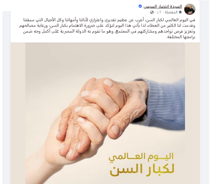 وكتبت السيدة انتصار السيسى عبر صفحتها الرسمية على “فيس بوك”: فى اليوم العالمى لكبار السن، أعرب عن عظيم تقديرى واعتزازى لآبائنا وأمهاتنا وكل الأجيال التى سبقتنا وقدمت لنا الكثير من العطاء، لذا يأتى هذا اليوم لنؤكد على ضرورة الاهتمام بكبار السن، ورعاية مصالحهم وتعزيز فرص تواجدهم ومشاركتهم فى المجتمع، وهو ما تقوم به الدولة المصرية على أكمل وجه ضمن برامجها المختلفة.