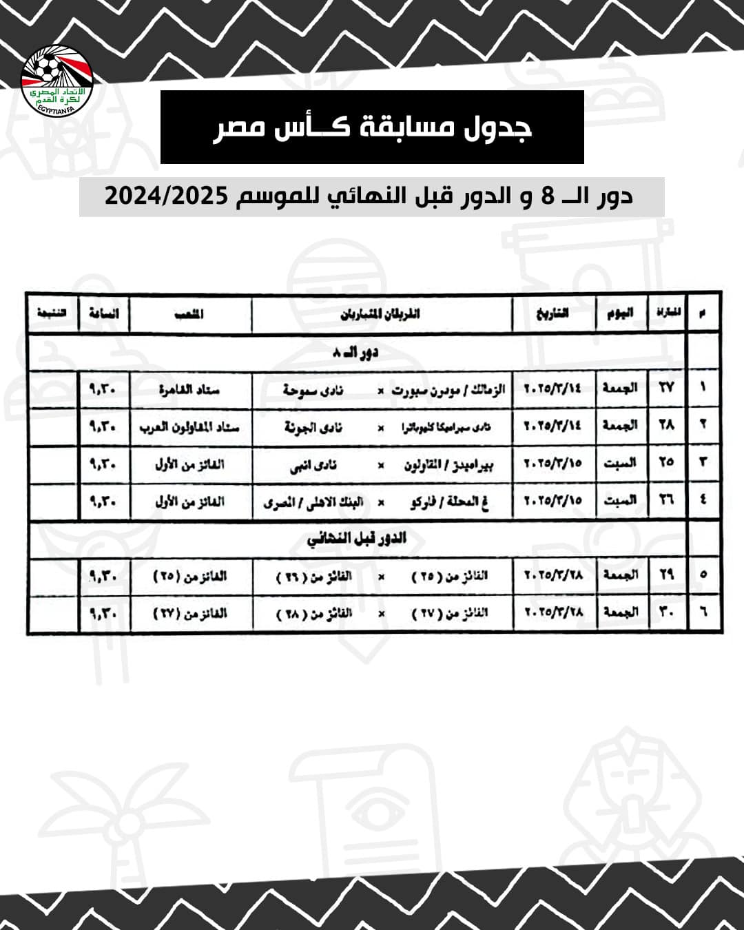 ويلعب الفائز من لقاء الزمالك ومودرن سبورت، ضد سموحة، يوم الجمعة 14 مارس المقبل في ربع نهائي كأس مصر.