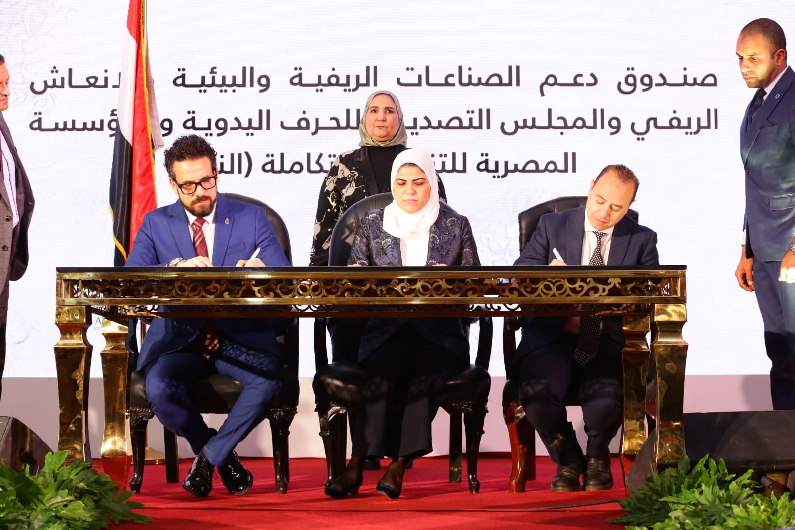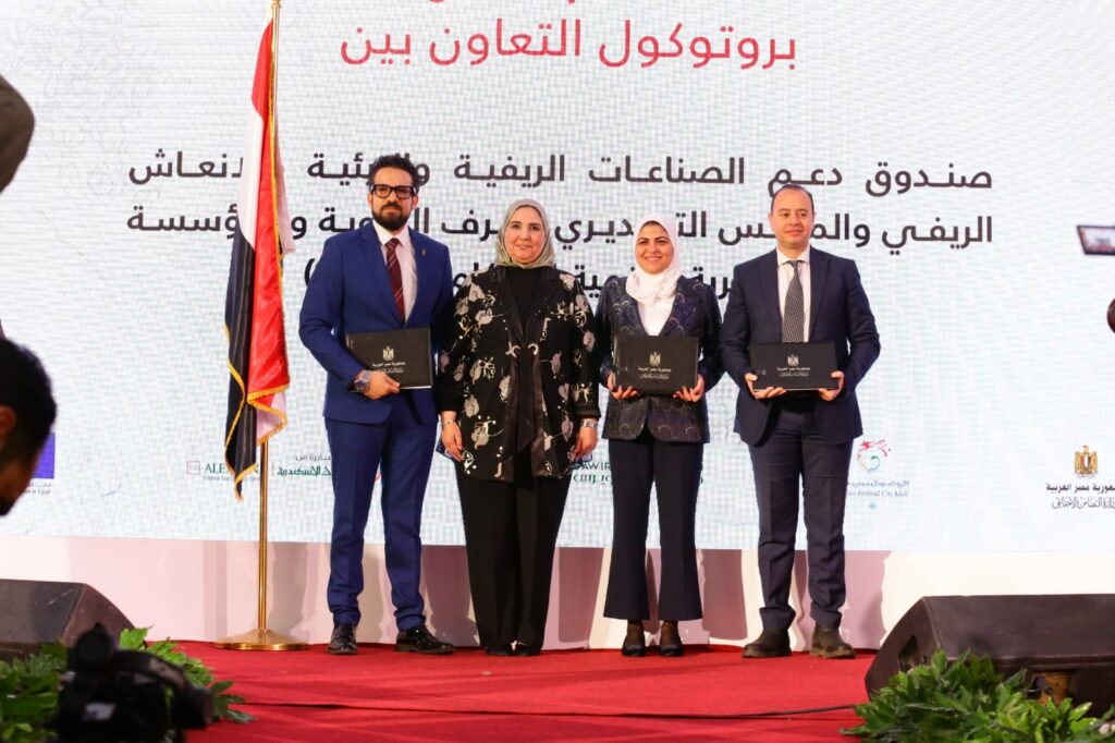 كما شهدت وزيرة التضامن الاجتماعي توقيع بروتوكول التعاون بين صندوق دعم الصناعات الريفية والبيئية والإنعاش الريفي والمجلس التصديري للحرف اليدوية ومؤسسة النداء، ويهدف البروتوكول إلى إنشاء مصنع سجاد يدوي يضم 800 عامل وأكثر من 200 نول، مع اعتبار دعم فرص التمكين الاقتصادي للمستفيدين من “تكافل وكرامة” القادرين على العمل لتخريجهم من الدعم إلى الإنتاج.